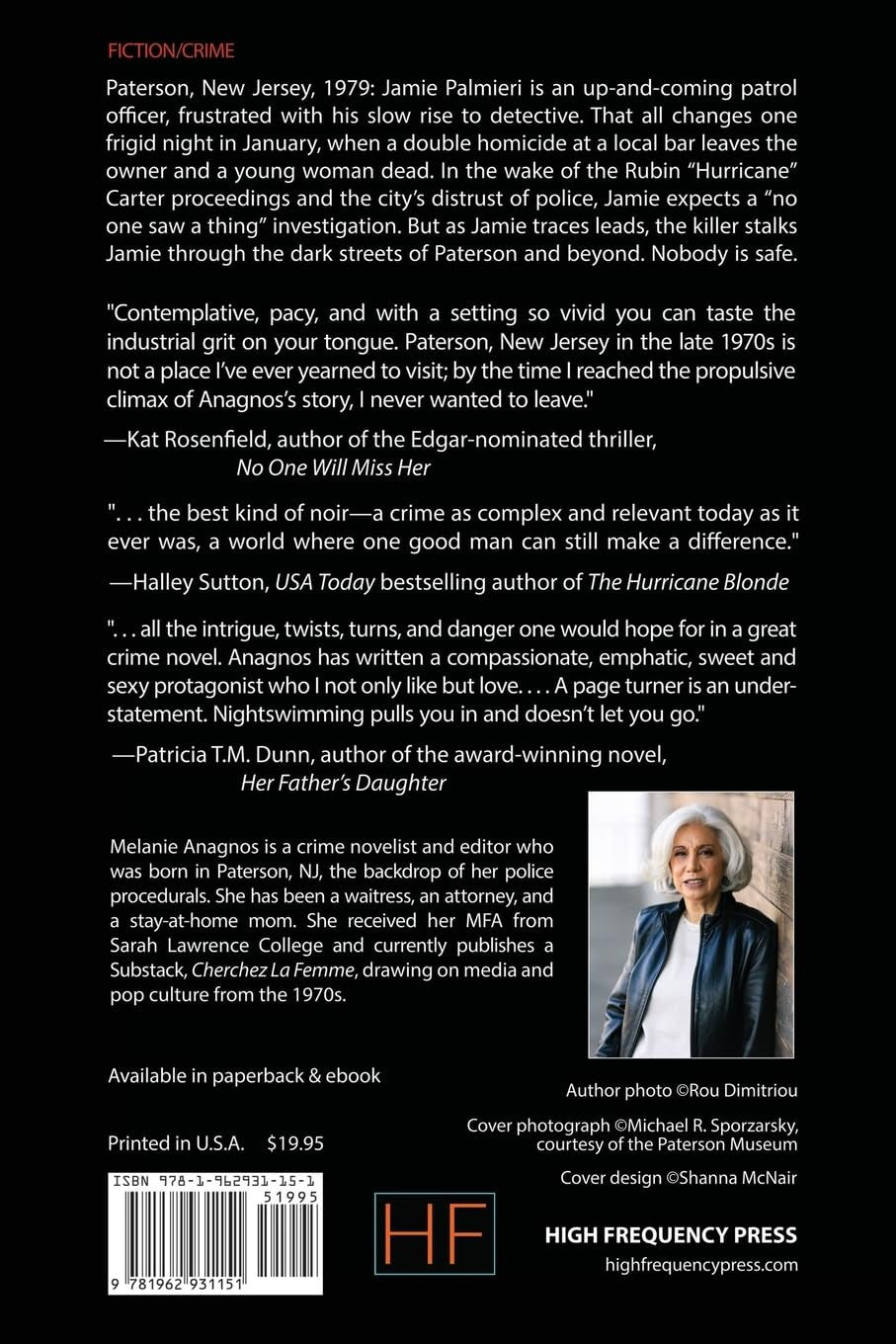 Paterson, New Jersey, 1979: Jamie Palmieri is an up-and-coming patrol officer, three years out of the academy and frustrated with his slow rise to detective. That all changes one frigid night in January, when a double homicide at a local bar leaves the owner and a young woman dead. In the wake of the Rubin "Hurricane" Carter proceedings and the city's lingering distrust for the police, Jamie is told to expect a "no one saw a thing" investigation. But as Jamie traces a series of small leads, he's sent on a path where the tables turn suddenly - with the still-unknown killer now stalking Jamie and the people he's closest to. A classic police procedural charged with the social turbulence of the 1970s. Editorial Reviews A New and Noteworthy Selection, The New York Times (2025) "Anagnos smartly uses the structure of the police procedural to probe the ways in which the 1970s were both an incredibly progressive and sneakily regressive time for women - and the ways men struggled to keep up when things were changing at such a dizzying clip...and brings Paterson, at this juncture, to vivid life." - Sarah Weinman, The New York TimesBook Review "...debut novelist Anagnos sweats so many procedural details of Jamie's painstaking investigation that you'll sweat along with him. The real star of this show is Paterson, which feels as menacing, vivid, and multilayered as Walter Mosley's Watts."-Kirkus Review "Contemplative, pacy, and with a setting so vivid you can taste the industrial grit on your tongue. Paterson, New Jersey in the late 1970s is not a place I've ever yearned to visit; by the time I reached the propulsive climax of Anagnos's story, I never wanted to leave." -Kat Rosenfield, author of the Edgar Award-nominated thriller, No One Will Miss Her "Nightswimming is my favorite kind of crime novel-rich, character-driven crime that drops me right into the action. Melanie Anagnos beautifully conjures a 1970s Paterson, New Jersey that feels so lived in, I practically teleported. This is just the best kind of noir-a crime as complex and relevant today as it ever was, a world where one good man can still make a difference. I cannot wait to dive back into the world of Jamie Palmieri!" -Halley Sutton, USA Today bestselling author of The Hurricane Blonde "... all the intrigue, twists, turns, and danger one would hope for in a great crime novel. Anagnos has written a compassionate, emphatic, sweet and sexy protagonist who I not only like but love...A page turner is an understatement. Nightswimming pulls you in and doesn't let you go." -Patricia TM Dunn, author of the award-winning novel, Her Father's Daughter
