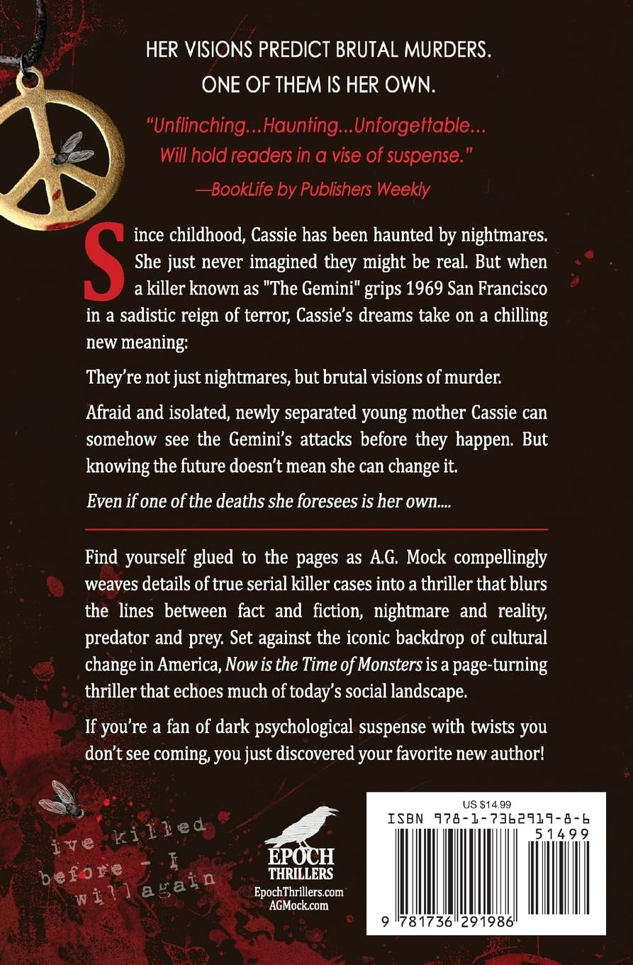 A reluctant psychic with visions of murder. A killer playing games with her mind. Each premonition pulls her deeper into his twisted trap. And closer to a truth she fears even more than death... "Haunting & Unforgettable... Holds Readers in a Vise of Suspense."–BookLife by Publishers Weekly Cassie has been haunted by nightmares since childhood—she just never imagined they might be real. But when a sadistic killer known as the Gemini begins targeting vulnerable young mothers across the Bay area, it's clear that Cassie's night terrors are now more than dreams... they're brutal visions of murder. As her premonitions grow darker and the Gemini's cryptic clues hit closer to home, Cassie must face the most terrifying possibility of all: that the monster she's hiding from might be the one she knows best, and uncovering the truth could cost her the unthinkable... ⚡ EDITOR'S PICK⚡Publishers Weekly BookLife⚡ ★★★★★ "Had me holding my breath the entire time!" -Amazon review ★★★★★ "An absolute page-turner that kept me guessing to the very end!" -Amazon review ★★★★★ "A.G. Mock delivers an atmospheric masterpiece...I devoured every page." -Dacre Stoker, bestselling author and great grand-nephew of Bram Stoker ---- Set against the iconic backdrop of 1969 San Francisco, you'll be turning pages late into the night as A.G. Mock weaves details of the most notorious true-crime cases into a compelling thriller that blurs the lines between fact and fiction, nightmare and reality, predator and prey. Fans of Stacy Willingham’s A Flicker in the Dark or Graham Masterton’s The House of a Hundred Whispers, this is your next must-read thriller! Click BUY NOW to get your copy today!
