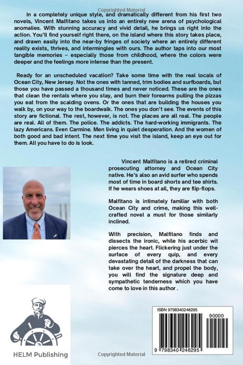 In a completely unique style, and dramatically different from his first two novels, Vincent Malfitano takes us into an entirely new arena of psychological anomalies. With stunning accuracy and vivid detail, he brings us right into the action. You’ll find yourself right there, on the island where this story takes place, and drawn easily into the near-by fringes of society where an entirely different reality exists, thrives, and intermingles with ours. The author taps into our most tangible memories – especially those from childhood, where the colors were deeper and the feelings more intense than the present. Once there, neither the soles of your feet nor the tenor of your soul find comfort in any other soil. Or, perhaps one should say, “sand.” Ready for an unscheduled vacation? Take some time with the real locals of Ocean City, New Jersey. Not the ones with tanned, trim bodies and surfboards, but those you have passed a thousand times and never noticed. These are the ones that clean the rentals where you stay, and burn their forearms pulling the pizzas you eat from the scalding ovens. Or the ones that are building the houses you walk by, on your way to the boardwalk. The ones you don’t see. The events of this story are fictional. The rest, however, is not. The places are all real. The people are real. All of them. The police. The addicts. The hard-working immigrants. The lazy Americans. Even Carmine. Men living in quiet desperation. And the women of both good and bad intent. The next time you visit the island, keep an eye out for them. All you have to do is look.