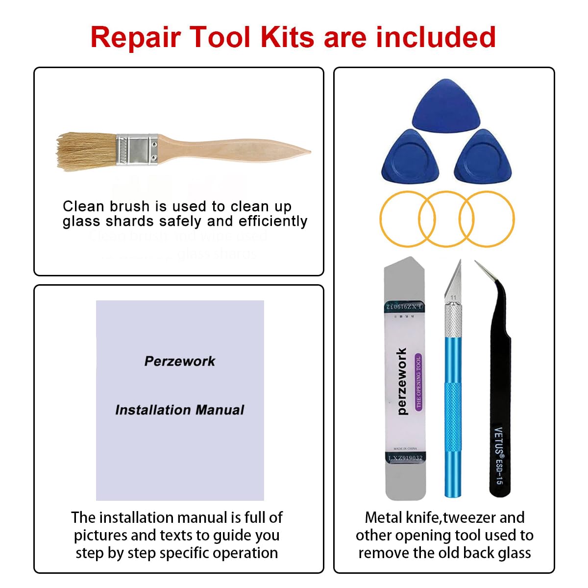 - 【Comes with Full Set Toolkit】It comes with a full set professional repair toolkit. It is much easier for you to remove the broken back glass.Please note that you need to prepare a hair dryer,becasuse the original adhesive is very strong.