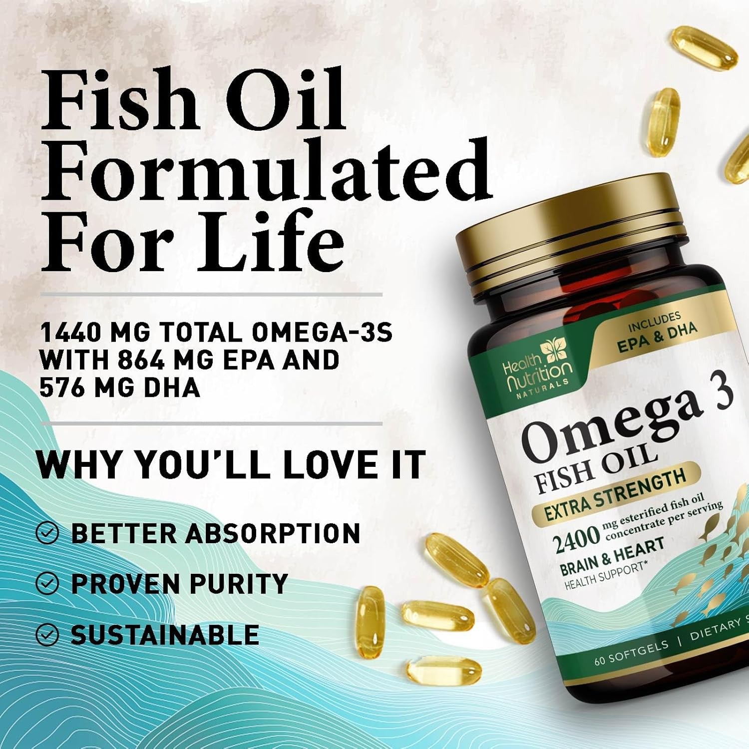 Omega 3 Fish Oil Triple Strength 1200 Mg, Omega-3 Supplements, Natural Brain Heart Health & Immune Support - Fatty Acids with EPA & DHA - Wild Caught Purified Fish Oil Supplement - 60 Softgels