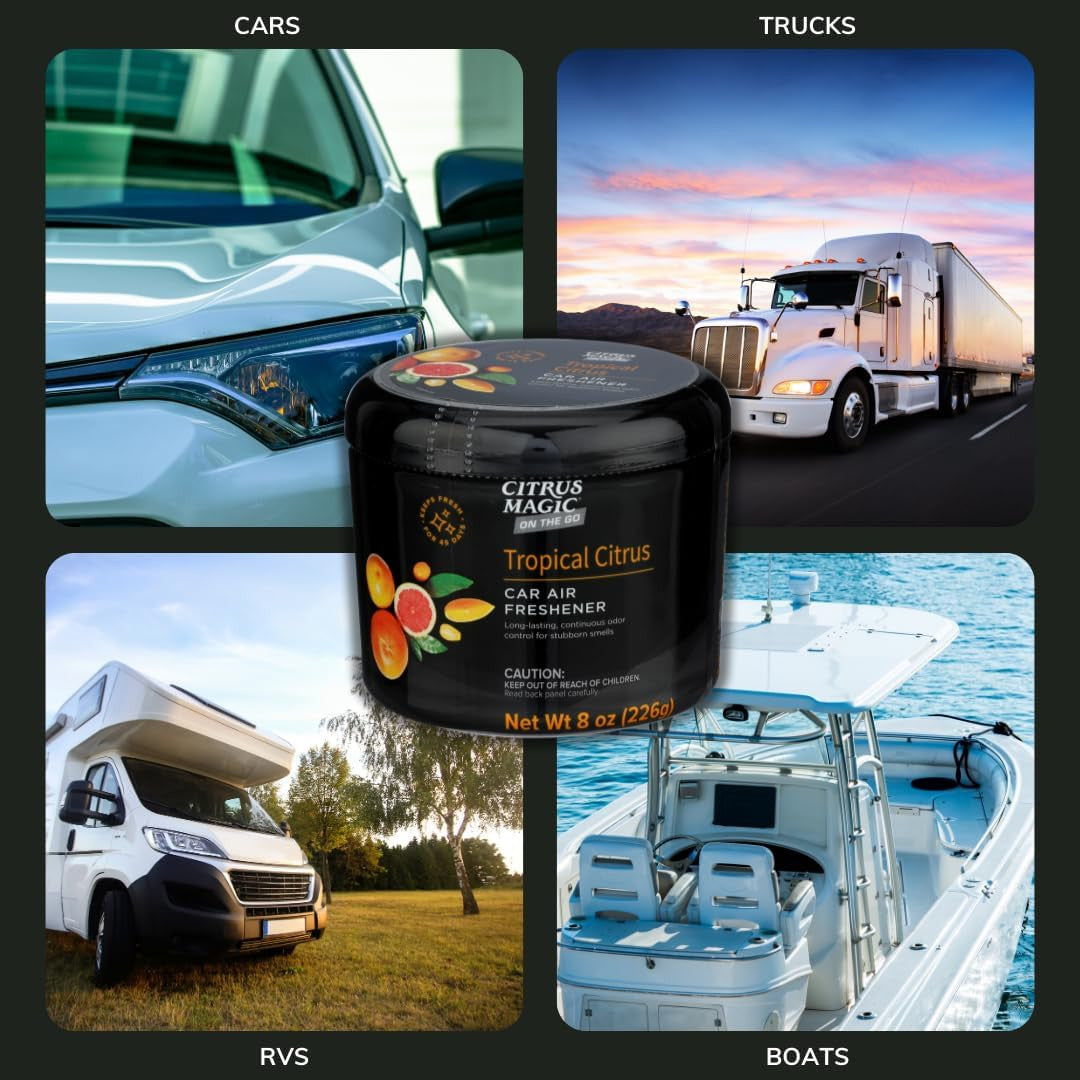 Small spaces require appropriately sized solutions, which is why our line of On The Go vehicle air fresheners work hard to eliminate odors without overwhelming small spaces. Quickly eliminate odors from your car, truck, RV, and more, with Citrus Magic On The Go Solid Odor Absorbers. Our unique formula contains baking soda and vegetable-based odor eliminators to absorb odors around the clock for up to 8 weeks, freshening the air in your vehicle. Eliminate smoke, pet odors, and food odors. Continuous, convenient odor control, 24/7. Simply place the solid odor absorber under the seat in your car, or in your trunk or cargo area, and absorb foul odors. Enjoy the drive!