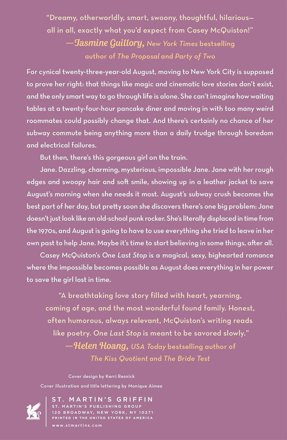 Casey McQuiston’s One Last Stop is a magical, sexy, big-hearted romance where the impossible becomes possible as August does everything in her power to save the girl lost in time.