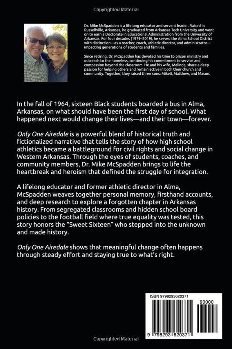 In the fall of 1964, sixteen Black students boarded a bus in Alma, Arkansas, on what should have been the first day of school. What happened next would change their lives—and their town—forever. Only One Airedale tells the story of how high school athletics became a battleground for civil rights and social change in Western Arkansas. Through the eyes of students, coaches, and community members, Dr. Mike McSpadden brings to life the heartbreak and heroism that defined the struggle for integration. A lifelong educator and former athletic director in Alma, McSpadden weaves a fictionalized tale, informed by deep historical research, to explore a forgotten chapter in Arkansas history. From segregated classrooms and hidden school board policies to the football field where true equality was tested, this story honors the “Sweet Sixteen” who stepped into the unknown and made history. Only One Airedale shows that meaningful change often happens through steady effort and staying true to what’s right.