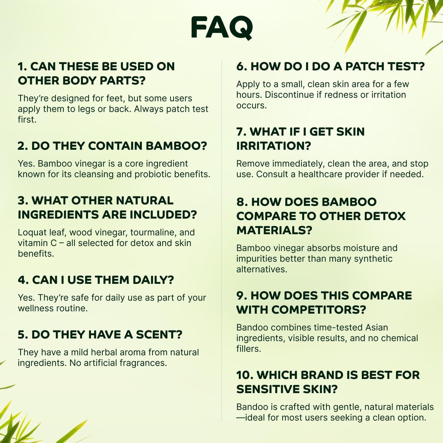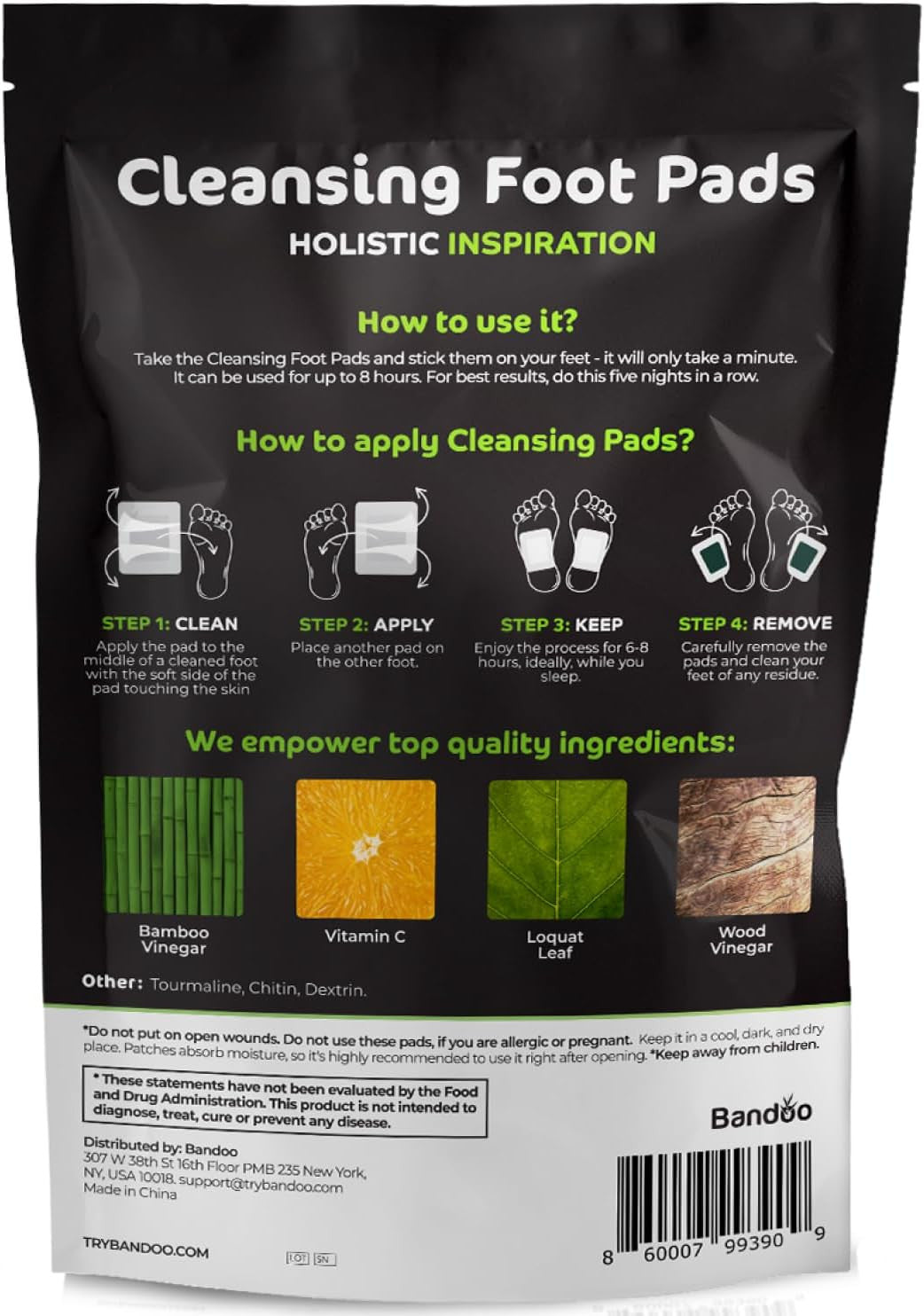 How long should I wear the Bandoo Cleansing Foot Pads? For optimal results, we recommend wearing the pads overnight while you sleep. This allows the ingredients to work most effectively. How often should I use Bandoo Pads? For best results, we recommend using Bandoo Cleansing Foot Pads every night. However, the frequency can be adjusted based on your personal needs and the advice of your healthcare provider. Can I use Bandoo Cleansing Foot Pads on other parts of my body? While Bandoo Cleansing Foot Pads are designed for use on the soles of the feet, some users have found them effective when used on other parts of the body. However, we recommend consulting with a healthcare provider before applying them to other areas Will I see immediate results with Bandoo Cleansing Foot Pads? The effects of Bandoo Cleansing Foot Pads can vary from person to person. Some users may notice immediate results, while others may need to use the pads consistently over a period of time to see changes. Can I use Cleansing Foot Pads during the day? Yes, you can use Bandoo Cleansing Foot Pads during the day, but for optimal results, we recommend using them overnight while you sleep.