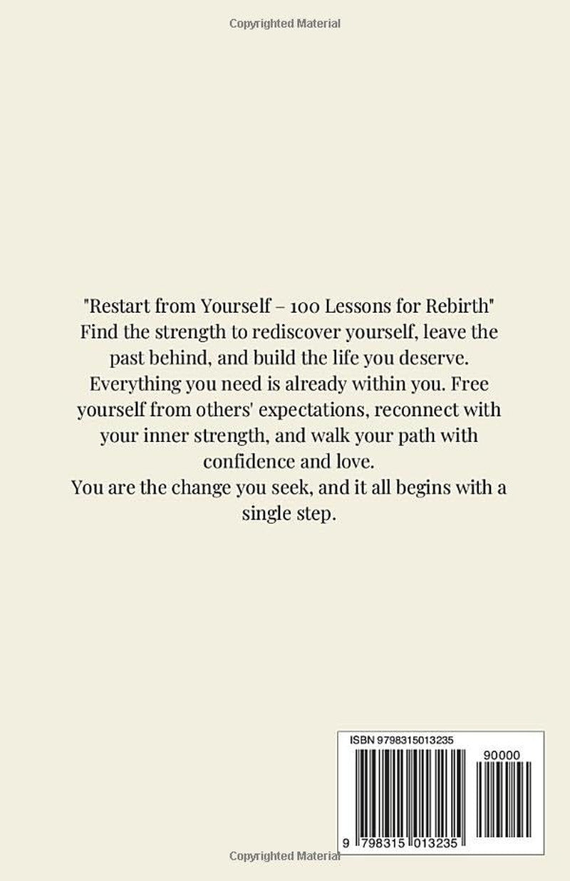 Restart from Yourself: 100 Lessons for Rebirth is more than just a book; it’s a true travel companion for anyone wishing to rediscover themselves, overcome difficult moments, and build a more authentic and serene life. In these pages, you'll find 100 valuable lessons designed to help you reconnect with your inner strength, let go of what no longer serves you, and look toward the future with greater confidence. Each reflection is a small yet powerful push toward change—an invitation to stop living according to others' expectations and start making choices for yourself. This book is for those tired of feeling stuck, those who sense they deserve more but don't know where to begin. It’s for those searching for answers, wanting to learn how to love themselves more, and needing that spark capable of lighting the path to rebirth. With simple, authentic, and straightforward language, Restart from Yourself will help you regain clarity, trust, and motivation to reclaim your life and make it extraordinary. Why you'll love this book: 100 inspiring lessons guiding you step-by-step toward a new version of yourself. Practical insights and deep reflections to overcome fears and insecurities. Concrete help to rediscover your authenticity and the courage to be yourself. The push you've been seeking to begin your journey of rebirth. Allow yourself to be inspired, restart from yourself, and begin the change you deserve today!