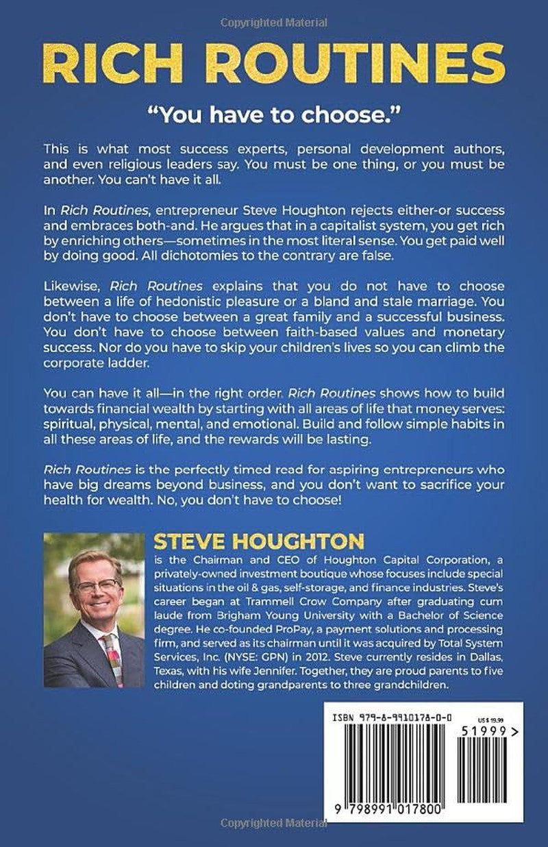 “You have to choose.” This is what most success experts, personal development authors, and even religious leaders say. You must be one thing, or you must be another. You can’t have it all. In Rich Routines, entrepreneur Steve Houghton rejects either-or success and embraces both-and. He argues that in a capitalist system, you get rich by enriching others—sometimes in the most literal sense. You get paid well by doing good. All dichotomies to the contrary are false. Likewise, Rich Routines explains that you do not have to choose between a life of hedonistic pleasure or a bland and stale marriage. You don’t have to choose between a great family and a successful business. You don’t have to choose between faith-based values and monetary success. Nor do you have to skip your children’s lives so you can climb the corporate ladder. You can have it all—in the right order. Rich Routines shows how to build towards financial wealth by starting with all areas of life that money serves: spiritual, physical, mental, and emotional. Build and follow simple habits in all these areas of life, and the rewards will be lasting.