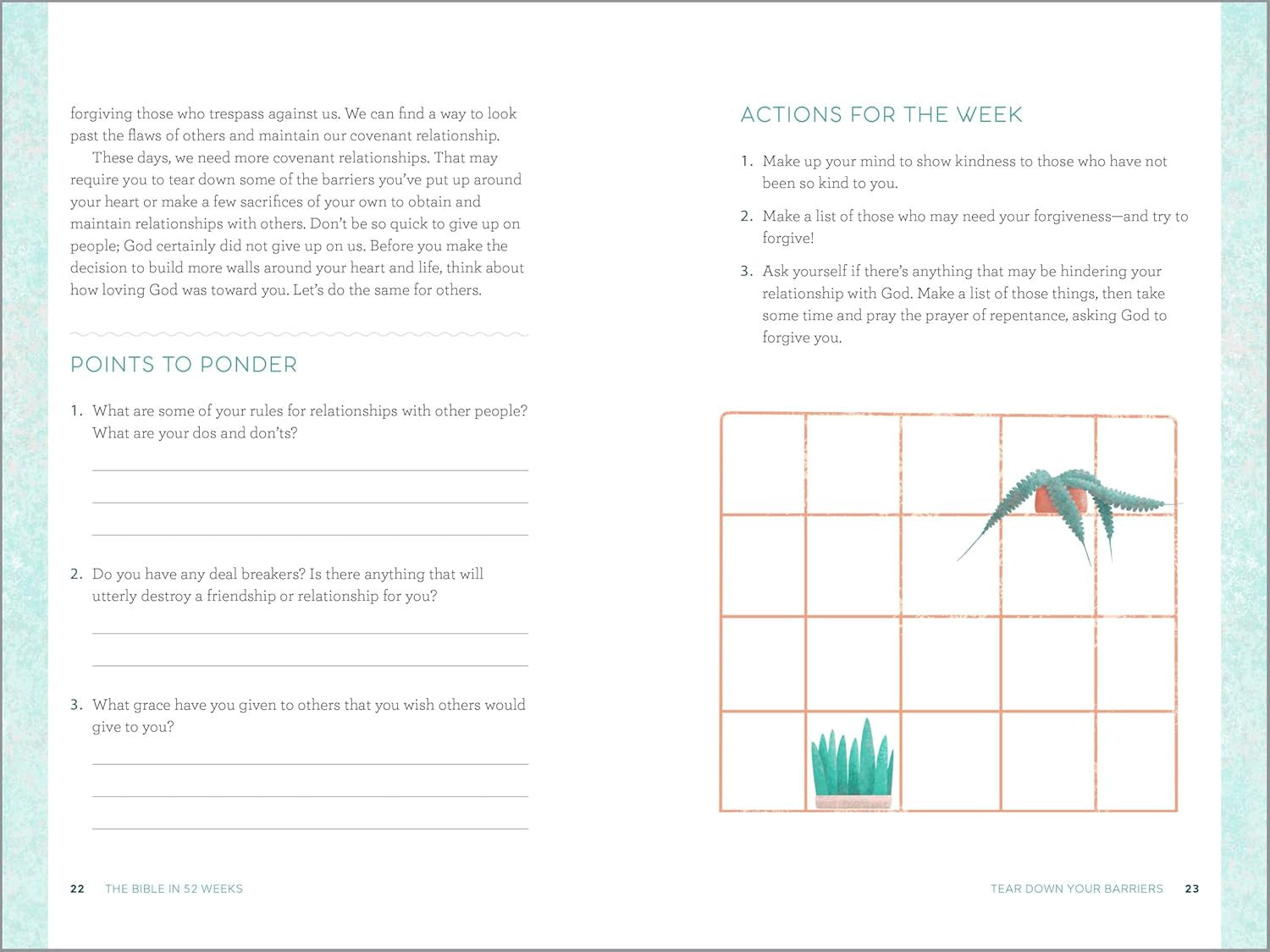 Strengthen your faith week by week with this yearlong journey through the Bible for women―Now a USA Today bestseller! When you need to lift your spirits or tackle life's challenges, the Bible is always there to offer guidance. This inspiring Bible study for women combines a daily reading plan with weekly opportunities to reflect, discuss, and explore how God's wisdom can be applied to your daily life. The unique approach goes beyond other Christian books for women with: Themed readings for women―All verses for a given week tie together with themes that relate to modern women, like persevering through challenges, moving on from mistakes, and more. Your favorite translation―The included reading plans work with any translation, allowing you to use your favorite Bible to connect with God more deeply. Many ways to study―Explore the interactive questions, Bible journaling prompts, and prayers on your own or in a group setting of any denomination with The Bible in 52 Weeks. Don't forget the companion book―Use this bestselling Bible study alongside Small Group Workbook: The Bible in 52 Weeks for Women and practice your faith with friends and loved ones! Get to know the Word in a new light and strengthen your relationship with Christ in The Bible in 52 Weeks.