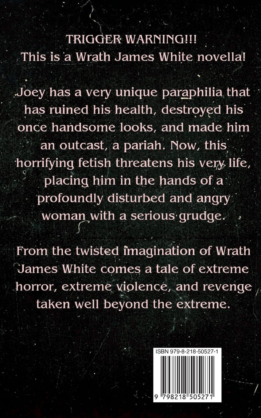 Joey has a very unique paraphilia that has ruined his health, destroyed his once handsome looks, and made him an outcast, a pariah. Now, this horrifying fetish threatens his very life, placing him in the hands of a profoundly disturbed and angry woman with a serious grudge. From the twisted imagination of Wrath James White comes a tale of extreme horror, extreme violence, and revenge taken well beyond the extreme.