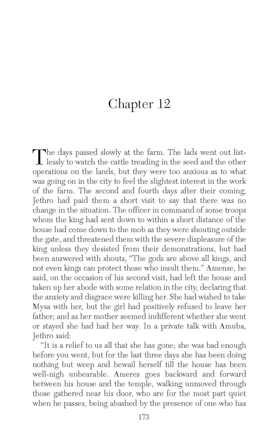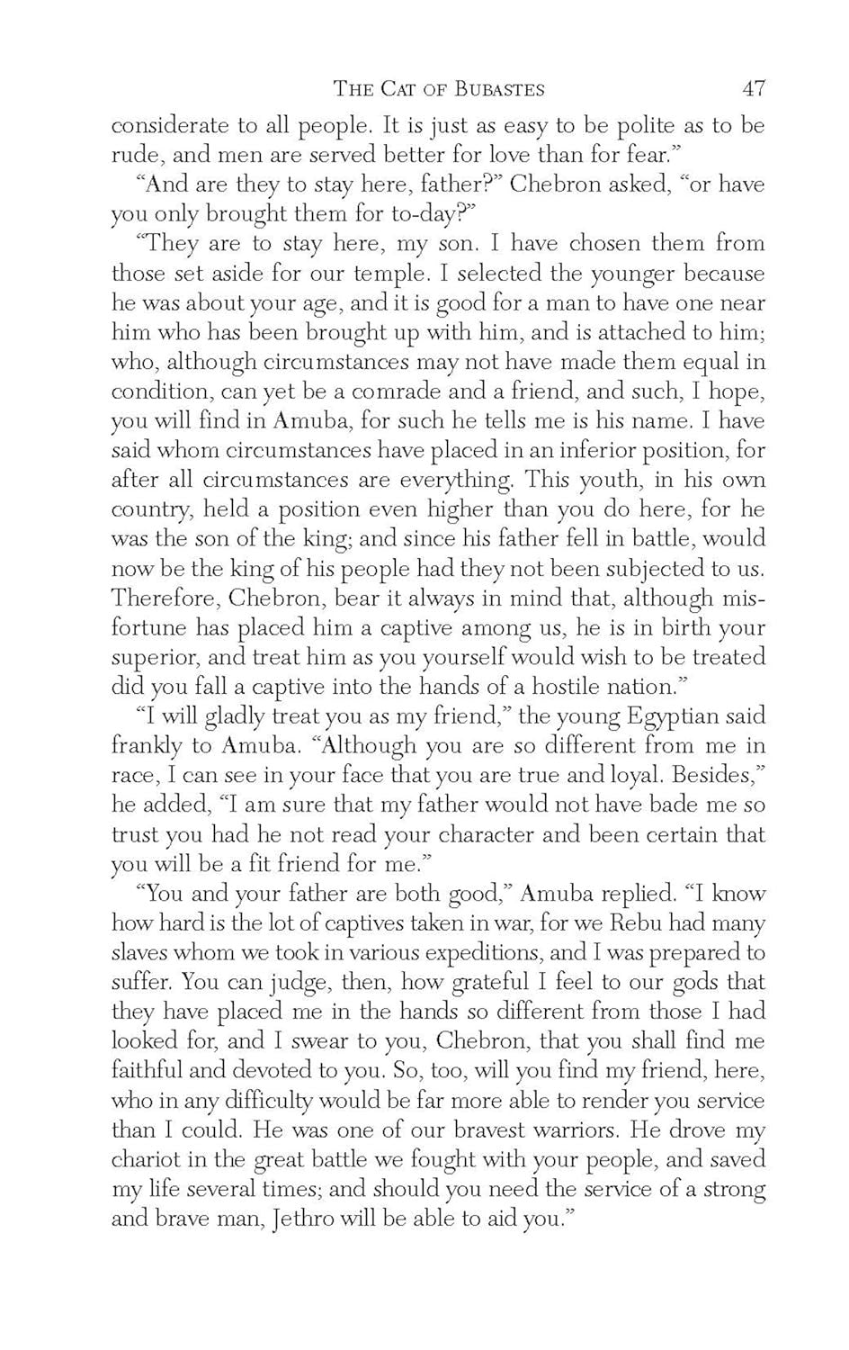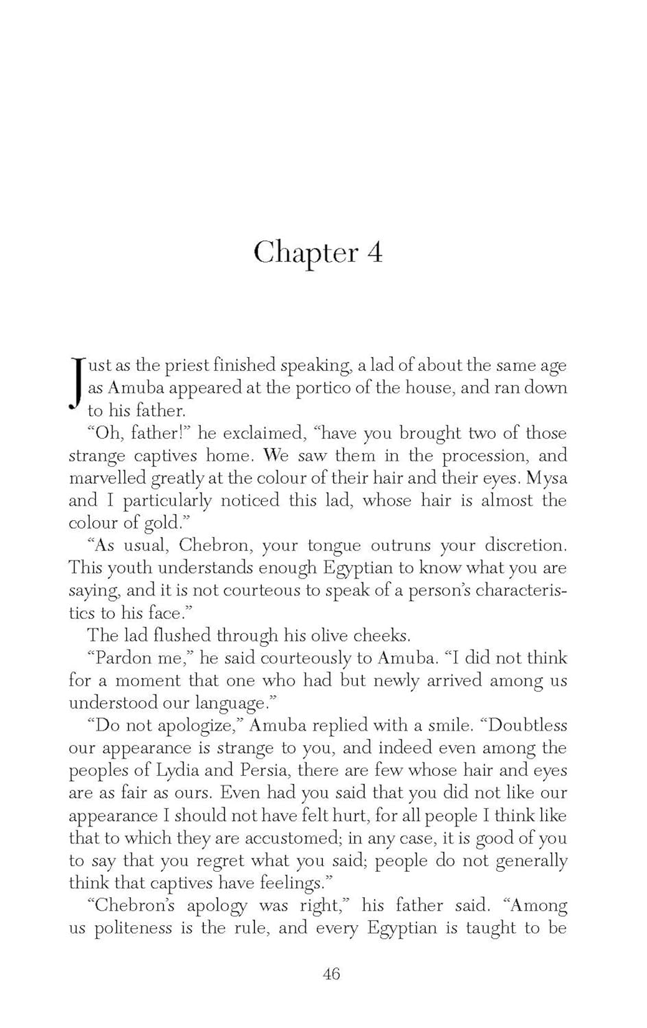 Chebron, the young son of an Egyptian high priest, and Amuba, a young slave in the boy's household, are close friends, but their lives are greatly altered when Chebron accidentally kills a cat, an animal held sacred by the ancient Egyptians. Forced to flee for their safety, the boys and their companions begin a long and dangerous journey. A thrilling adventure story, this is a must-read tale packed with rich, historical information.Young readers will learn about ancient Egyptian religion and geography, how the Nile was used for irrigation, and how the Egyptians made war and were prepared for burial.