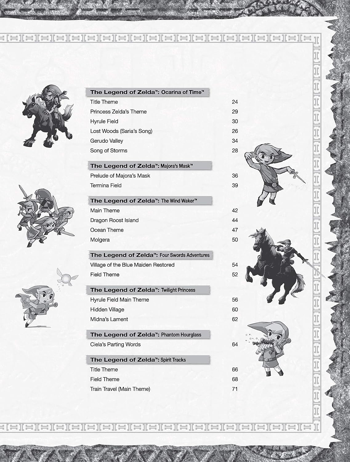 Titles: * The Legend of Zelda(tm) Title Theme * The Legend of Zelda(tm) Main Theme * Zelda II(tm) - The Adventure of Link(tm) Title Theme * Zelda II(tm) - The Adventure of Link(tm) Palace Music * The Legend of Zelda(tm): A Link to the Past(tm) Title Screen * The Legend of Zelda(tm): A Link to the Past(tm) Hyrule Castle Music * The Legend of Zelda(tm): A Link to the Past(tm) Main Theme * The Legend of Zelda(tm): A Link to the Past(tm) The Dark World * The Legend of Zelda(tm): Link's Awakening(tm) Main Theme * The Legend of Zelda(tm): Ocarina of Time(tm) Title Theme * The Legend of Zelda(tm): Ocarina of Time(tm) Princess Zelda's Theme * The Legend of Zelda(tm): Ocarina of Time(tm) Hyrule Field * The Legend of Zelda(tm): Ocarina of Time(tm) Lost Woods (Saria's Song) * The Legend of Zelda(tm): Ocarina of Time(tm) Gerudo Valley * The Legend of Zelda(tm): Ocarina of Time(tm) Song of Storms * The Legend of Zelda(tm): Majora's Mask(tm) Prelude of Majora's Mask * The Legend of Zelda(tm): Majora's Mask(tm)Termina Field * The Legend of Zelda(tm): The Wind Waker(tm) Main Theme * The Legend of Zelda(tm): The Wind Waker(tm) Dragon Roost Island * The Legend of Zelda(tm): The Wind Waker(tm) Ocean Theme * The Legend of Zelda(tm): The Wind Waker(tm) Molgera * The Legend of Zelda(tm): Four Swords Adventures Village of the Blue Maiden Restored * The Legend of Zelda(tm): Four Swords Adventures Field Theme * The Legend of Zelda(tm): Twilight Princess Hyrule Field Main Theme * The Legend of Zelda(tm): Twilight Princess Hidden Village * The Legend of Zelda(tm): Twilight Princess Midna's Lament * The Legend of Zelda(tm): Phantom Hourglass Ciela's Parting Words * The Legend of Zelda(tm): Spirit Tracks Title Theme * The Legend of Zelda(tm): Spirit Tracks Field Theme * The Legend of Zelda(tm): Spirit Tracks Train Travel (Main Theme) * The Legend of Zelda(tm) Triforce Fanfare * The Legend of Zelda(tm) Correct Solution * The Legend of Zelda(tm) Whistle of Warp.