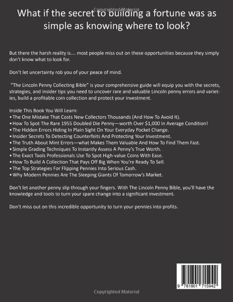 Are you tired of watching your pennies pile up, worthless and forgotten? Do you dream of turning your spare change into a fortune? What if the secret to building a fortune was as simple as knowing where to look? But there the harsh reality is…. most people miss out on these opportunities because they simply don't know what to look for. Don’t let uncertainty rob you of your peace of mind. “The Lincoln Penny Collecting Bible” is your comprehensive guide will equip you with the secrets, strategies, and insider tips you need to uncover rare and valuable Lincoln penny errors and varieties, build a profitable coin collection and protect your investment. Inside This Book You Will Learn: ✅ The one mistake that costs new collectors thousands (and how to avoid it) ✅ How to spot the rare 1955 doubled die penny—worth over $1,000 in average condition ✅ The hidden errors hiding in plain sight on your everyday pocket change ✅ Insider secrets to detecting counterfeits and protecting your investment ✅ The truth about mint errors—what makes them valuable and how to find them fast ✅ Simple grading techniques to instantly assess a penny’s true worth ✅ The exact tools professionals use to spot high-value coins with ease ✅ How to build a collection that pays off big when you’re ready to sell ✅ The top strategies for flipping pennies into serious cash ✅ Why modern pennies are the sleeping giants of tomorrow’s market Don't let another penny slip through your fingers. With The Lincoln Penny Bible, you'll have the knowledge and tools to turn your spare change into a significant investment. Don't miss out on this incredible opportunity to turn your pennies into profits. Get “The Lincoln Penny Collecting Bible” now and start unlocking the hidden wealth of Lincoln Pennies today!
