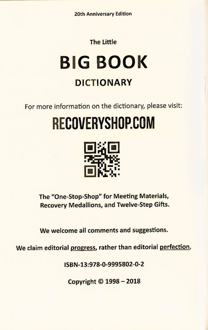 This book has over 2,000 words with definitions and their page locations. Great for studying the Big Book of Alcoholics Anonymous. Perfect for that newcomer or sponsee... Don't forget to order the 12 & 12 Dictionary too!