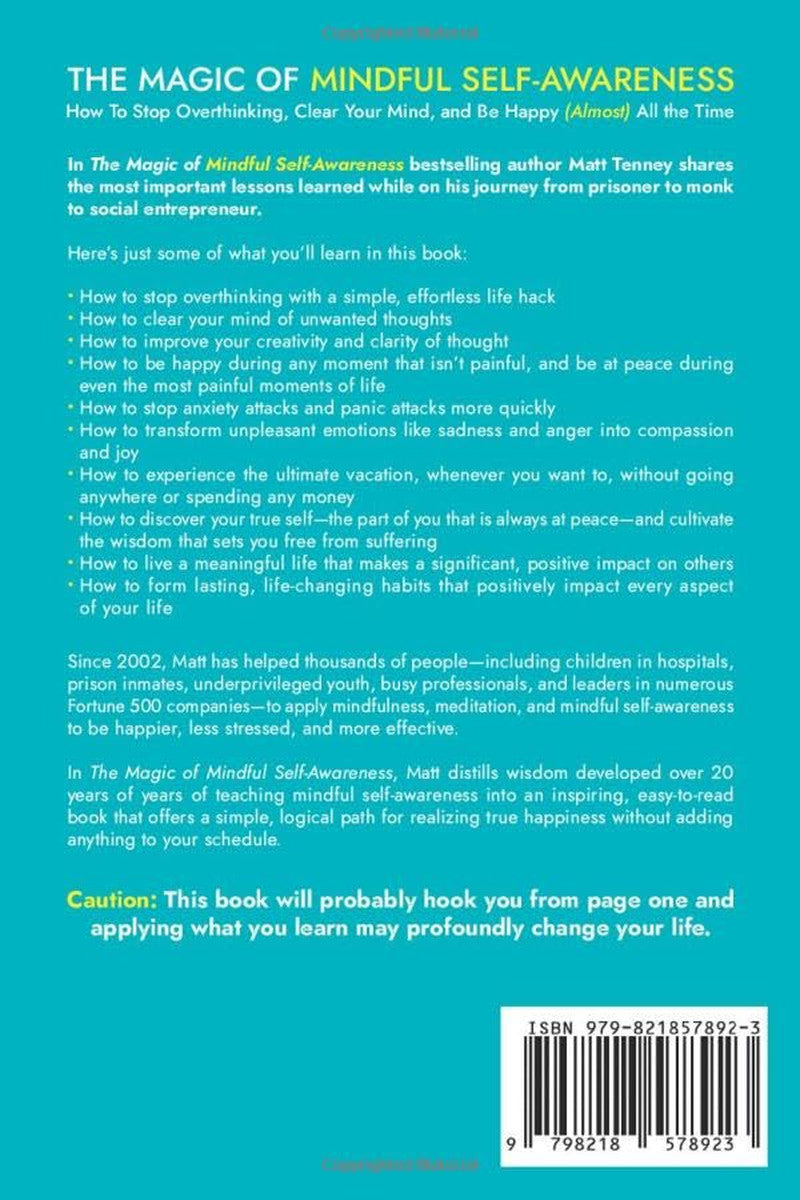 In The Magic of Mindful Self-Awareness bestselling author Matt Tenney shares the most important lessons learned while on his journey from prisoner to monk to social entrepreneur. In The Magic of Mindful Self-Awareness, Matt distills wisdom developed over 20 years of years of teaching mindful self-awareness into an inspiring, easy-to-read book that offers a simple, logical path for realizing true happiness without adding anything to your schedule. Caution: This book will probably hook you from page one and applying what you learn may profoundly change your life.