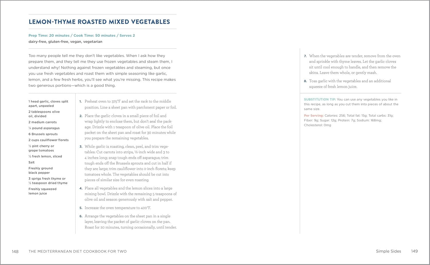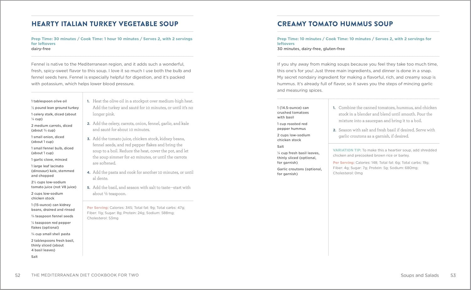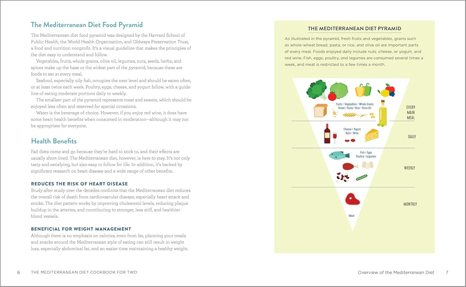 Set your Mediterranean table for two with perfectly portioned dishes With crisp veggies, succulent seafood, hearty grains, and healthy oils, the Mediterranean diet makes nutritious eating a pleasure. This cookbook brings its bright flavors and bountiful health benefits to your table with recipes designed for two people. Relax and savor a delicious breezy seaside breakfast or a simple rustic dinner, all without leaving home. Together, discover how a Mediterranean lifestyle can reduce the risk of heart disease, aid in weight loss, and more. Change your life with healthy eating by cooking up meals that feature quick prep times and seasonal, accessible ingredients like the below: Share the healthy Mediterranean diet with someone special. This cookbook for two makes it easy to cook in your kitchen and enjoy delicious, healthy food together.