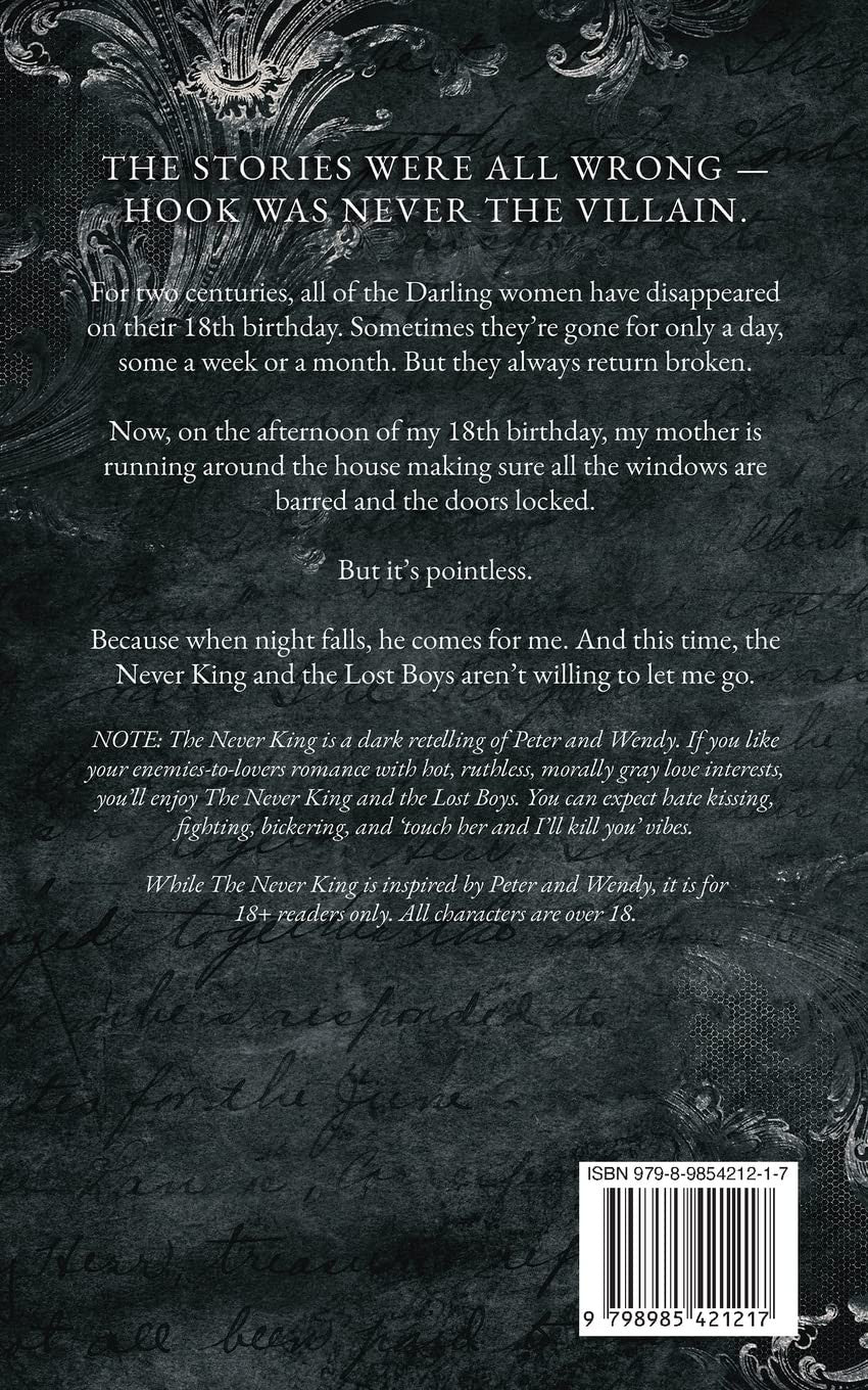 The stories were all wrong - Hook was never the villain. For two centuries, all of the Darling women have disappeared on their 18th birthday. Sometimes they're gone for only a day, some a week or a month. But they always return broken. Now, on the afternoon of my 18th birthday, my mother is running around the house making sure all the windows are barred and the doors locked. But it's pointless. Because when night falls, he comes for me. And this time, the Never King and the Lost Boys aren't willing to let me go. NOTE: The Never King is a reimagining of Peter and Wendy. Characters have been aged up for this darker, grittier version. If you like your enemies to lovers romance with hot, ruthless, morally gray love interests, you'll enjoy The Never King and the Lost Boys. You can expect hate kissing, fighting, bickering, and 'touch her and I'll unalive you' vibes. Book one ends on a cliff. Please check the author's website for CWs.