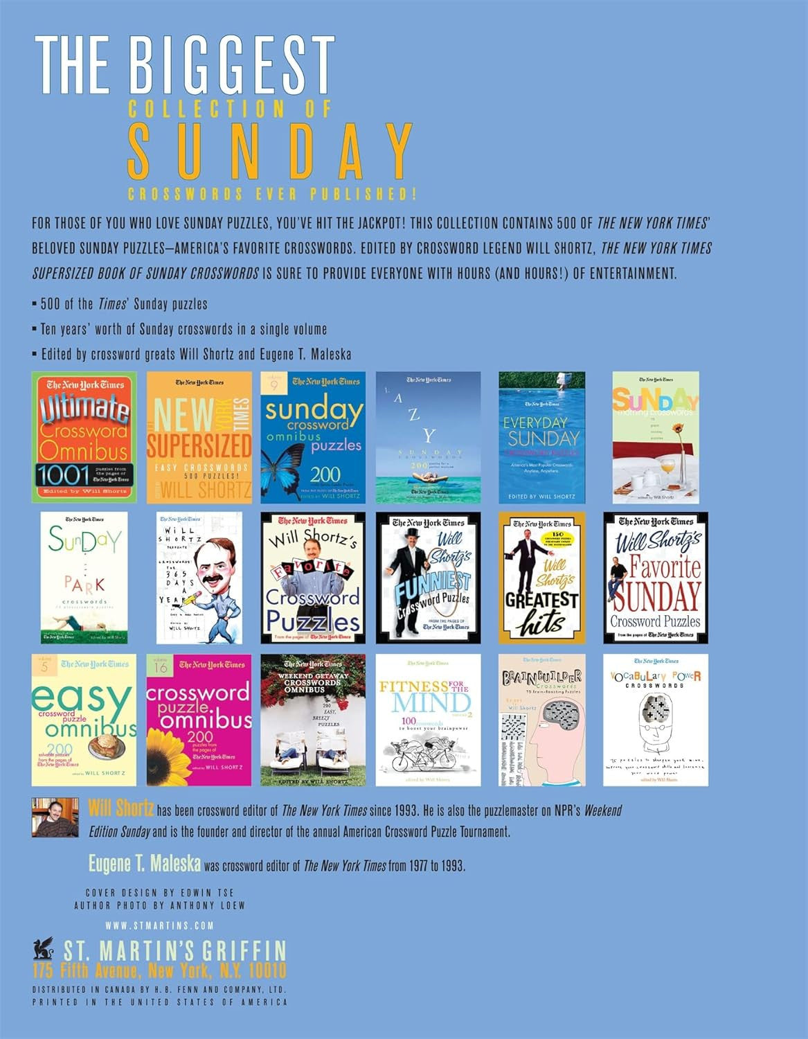 500 puzzles; the biggest collection of Sunday crosswords (the Times' most popular) EVER. Everything about the New York Times Supersized Book of Sunday Crosswords is, well, supersized. At one hour per puzzle (that's pretty fast!), eight hours of solving per day, it would still take two months of solid solving to finish this book.