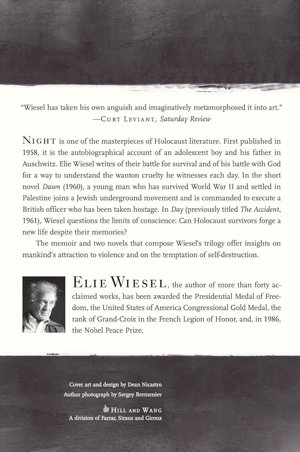 Night is one of the masterpieces of Holocaust literature. First published in 1958, it is the autobiographical account of an adolescent boy and his father in Auschwitz. Elie Wiesel writes of their battle for survival and of his battle with God for a way to understand the wanton cruelty he witnesses each day.