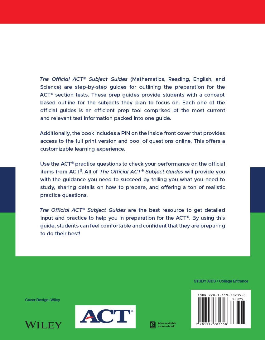 The ACT official subject guides are a step by step guide for outlining the preparation for the ACT section tests. These prep guides provide students a concept-based outline for the subjects they plan to focus on. Each one of the official guides, is an efficient prep tool comprised of the most current and relevant test information packed into one guide. In addition to the book, the entire pool of questions are available online for a customizable learning experience. The ACT official subject guides are the best resource to get detailed input and practice to help you in preparation for the ACT. By using this guide, students can feel comfortable and confident that they are preparing to do their best! Features of the ACT® Official Reading Guide Includes: The only book with real ACT reading questions organized by question type; Includes tips and advice for reading more quickly and retaining information; detailed explanations for every official ACT.