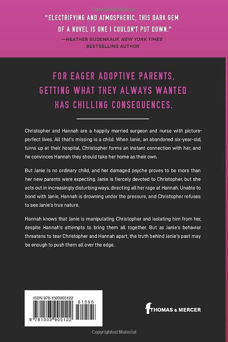 A Washington Post and Amazon Charts bestseller. A page-turning debut of suspense about a young couple desperate to have a child of their own―and the unsettling consequences of getting what they always wanted. Christopher and Hannah are a happily married surgeon and nurse with picture-perfect lives. All that’s missing is a child. When Janie, an abandoned six-year-old, turns up at their hospital, Christopher forms an instant connection with her, and he convinces Hannah they should take her home as their own. But Janie is no ordinary child, and her damaged psyche proves to be more than her new parents were expecting. Janie is fiercely devoted to Christopher, but she acts out in increasingly disturbing ways, directing all her rage at Hannah. Unable to bond with Janie, Hannah is drowning under the pressure, and Christopher refuses to see Janie’s true nature. Hannah knows that Janie is manipulating Christopher and isolating him from her, despite Hannah’s attempts to bring them all together. But as Janie’s behavior threatens to tear Christopher and Hannah apart, the truth behind Janie’s past may be enough to push them all over the edge.