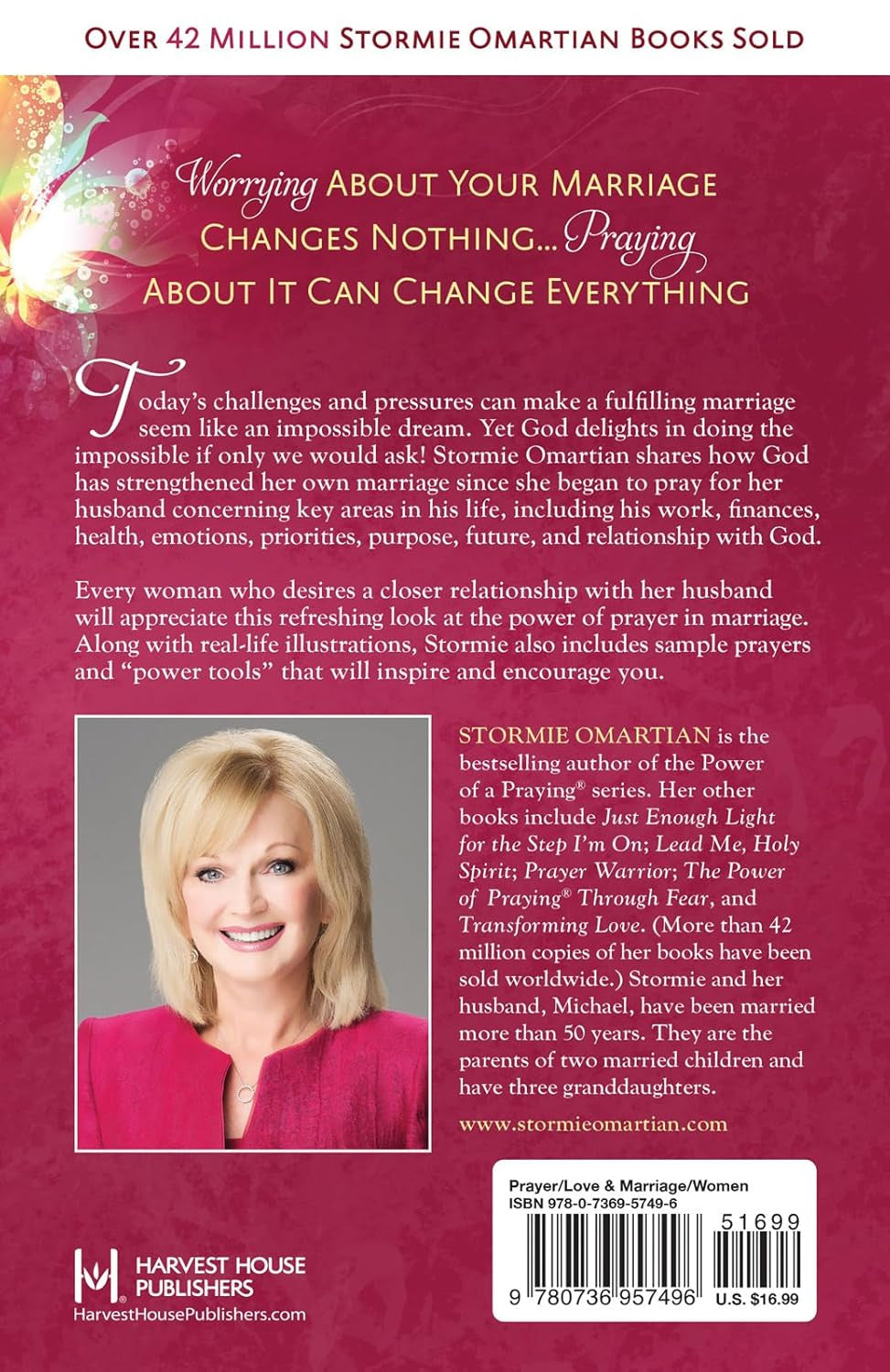 MORE THAN 10 MILLION COPIES SOLD Today's challenges can make a fulfilling marriage seem like an impossible dream. Yet God delights in doing the impossible if only we would ask! Stormie Omartian shares how God can strengthen your marriage as you pray for your husband concerning key areas in his life, including... You will be encouraged by Stormie's own experiences, along with the Bible verses and sample prayers included in each chapter. Join the millions of women who have been blessed by this life-changing look at the power of a wife's prayers.