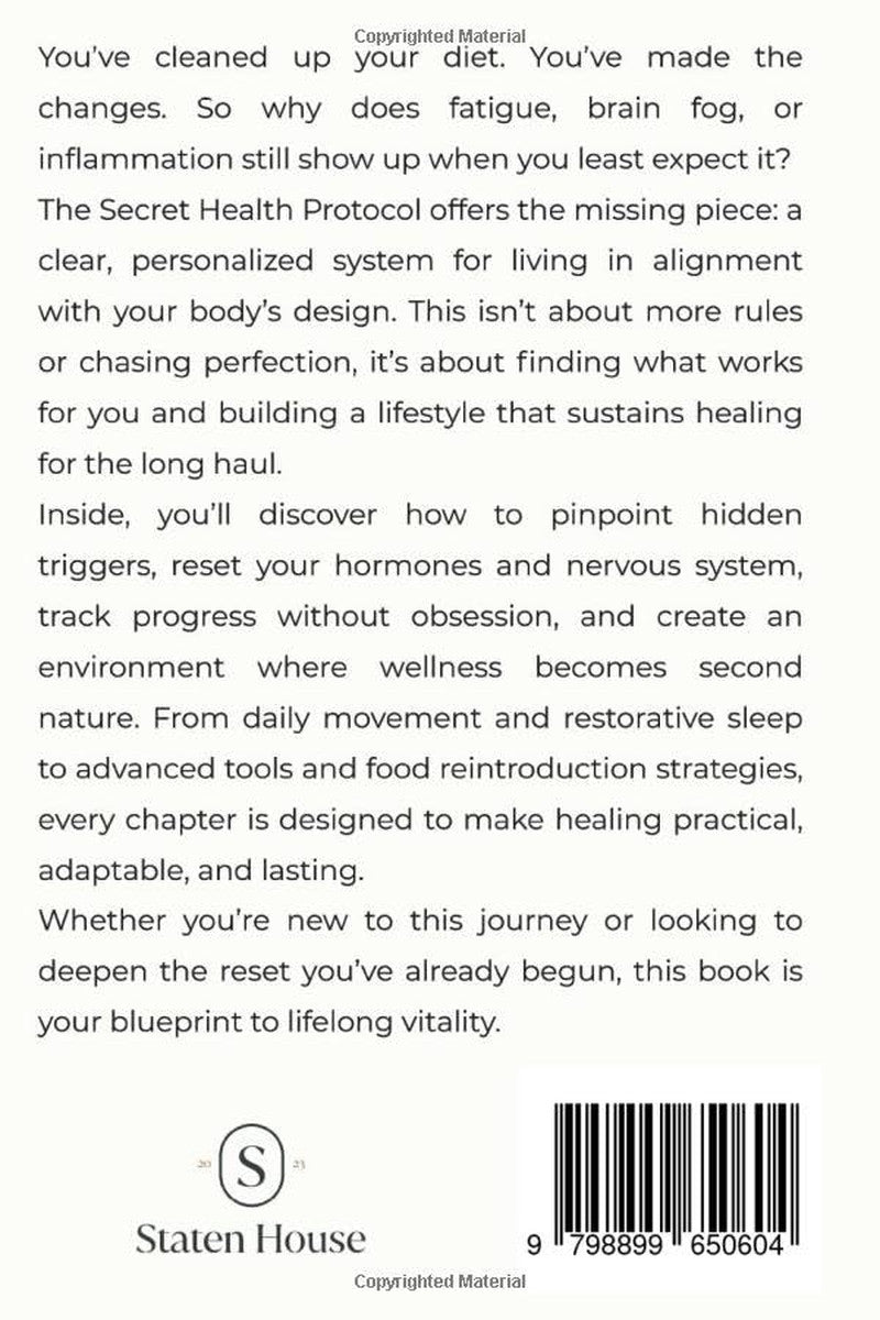 From the author of the bestseller The Secret Health Reset Book Healing begins the moment you stop fighting your body and start listening to it. Whether you’re just beginning to reclaim your health or ready to go deeper, The Secret Health Protocol gives you the next level of clarity and control. It builds on the same principles that have already helped thousands uncover the real causes of fatigue, inflammation, and brain fog, and takes them further into a practical, personalized system for lasting vitality. This isn’t about more rules or restrictions. It’s about learning how to work with your body’s natural rhythms, track real progress, and create an environment where healing isn’t temporary. It becomes your way of life. What You’ll Learn Inside ✅ How to identify and remove everyday triggers that quietly fuel inflammation and fatigue ✅ Restore your gut, hormones, and nervous system with a science-backed 3‑phase protocol ✅ The simplest way to track energy, mood, and digestion, and use that data to make real adjustments ✅ The science of deep, restorative sleep and how to reset your circadian rhythm for real healing ✅ Practical daily movement and stress-reset strategies that rebuild energy instead of draining it This isn’t another crash diet or rigid plan. It’s the framework for living in alignment with your body’s design, simple enough to start today, flexible enough to last for life. If The Secret Health Reset Book showed you why you’re still sick, this is the book that shows you how to stay well for life. Read it. Apply it. Build the health you were meant to have.