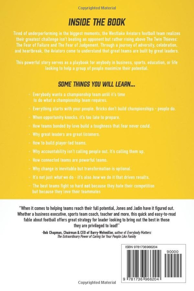 INSIDE THE BOOK Tired of underperforming in the biggest moments, the Westlake Aviators football team realizes their greatest challenge isn’t beating an opponent but rather rising above the Twin Thieves: the Fear of Failure and the Fear of Judgment. Through a journey of adversity, celebration, and heartbreak, the Aviators come to understand that great teams are built by great leaders. This powerful story serves as a playbook for anybody in business, sports, education, or life looking to help a group of people maximize their potential. Some things you will learn…