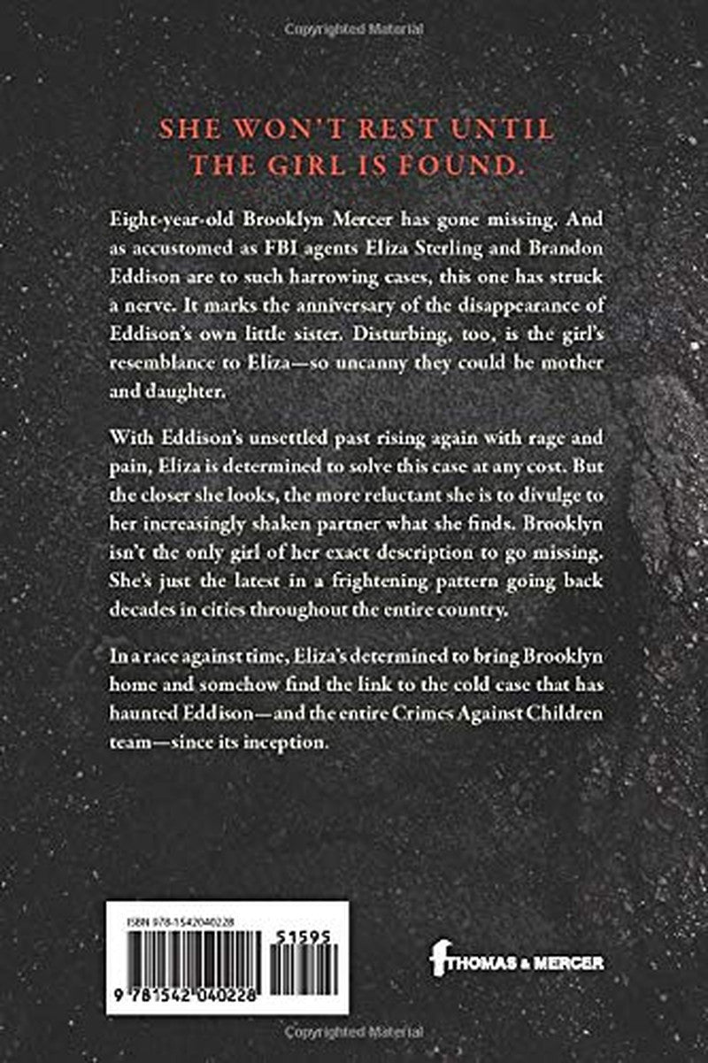 A recent abduction becomes an unexpected link to a decades-long spree of unspeakable crimes. Eight-year-old Brooklyn Mercer has gone missing. And as accustomed as FBI agents Eliza Sterling and Brandon Eddison are to such harrowing cases, this one has struck a nerve. It marks the anniversary of the disappearance of Eddison’s own little sister. Disturbing, too, is the girl’s resemblance to Eliza―so uncanny they could be mother and daughter. With Eddison’s unsettled past rising again with rage and pain, Eliza is determined to solve this case at any cost. But the closer she looks, the more reluctant she is to divulge to her increasingly shaken partner what she finds. Brooklyn isn’t the only girl of her exact description to go missing. She’s just the latest in a frightening pattern going back decades in cities throughout the entire country. In a race against time, Eliza’s determined to bring Brooklyn home and somehow find the link to the cold case that has haunted Eddison―and the entire Crimes Against Children team―since its inception.