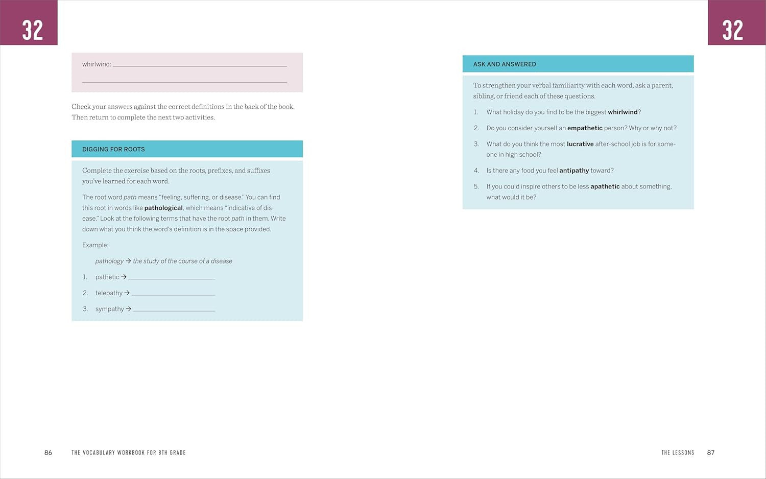 Build your 8th grader's vocabulary with this workbook featuring 36 lessons and 180 words Words have power! The Vocabulary Workbook for 8th Grade enhances your 8th grader's vocabulary skills with 180 fresh words and engaging exercises, all geared to the appropriate reading level. Perfect for summer bridge learning and back to school time, each lesson in this vocabulary workbook focuses on five words. The lessons introduce core meanings and reinforce correct usage through bite-sized challenges: matching words to context, identifying roots, finding synonyms or antonyms, and more. Get ready to be wowed―your 8th grader is on their way to gaining language superpowers! An educational teen summer activity, The Vocabulary Workbook for 8th Grade includes: 36 lessons―enough for one each week of the school year―that make this vocabulary workbook ideal for homeschooling, summer reviews, or supplemental learning. 180 Wondrous words―Discover a wide variety of useful, level-appropriate vocab words, from "avid" and "benign" to "vilified" and "whirlwind." Skill building―Work out the meanings of new words with a variety of exercises to engage your 8th grader and give them different ways to learn. Make learning vocabulary fun for middle schoolers with The Vocabulary Workbook for 8th Grade.