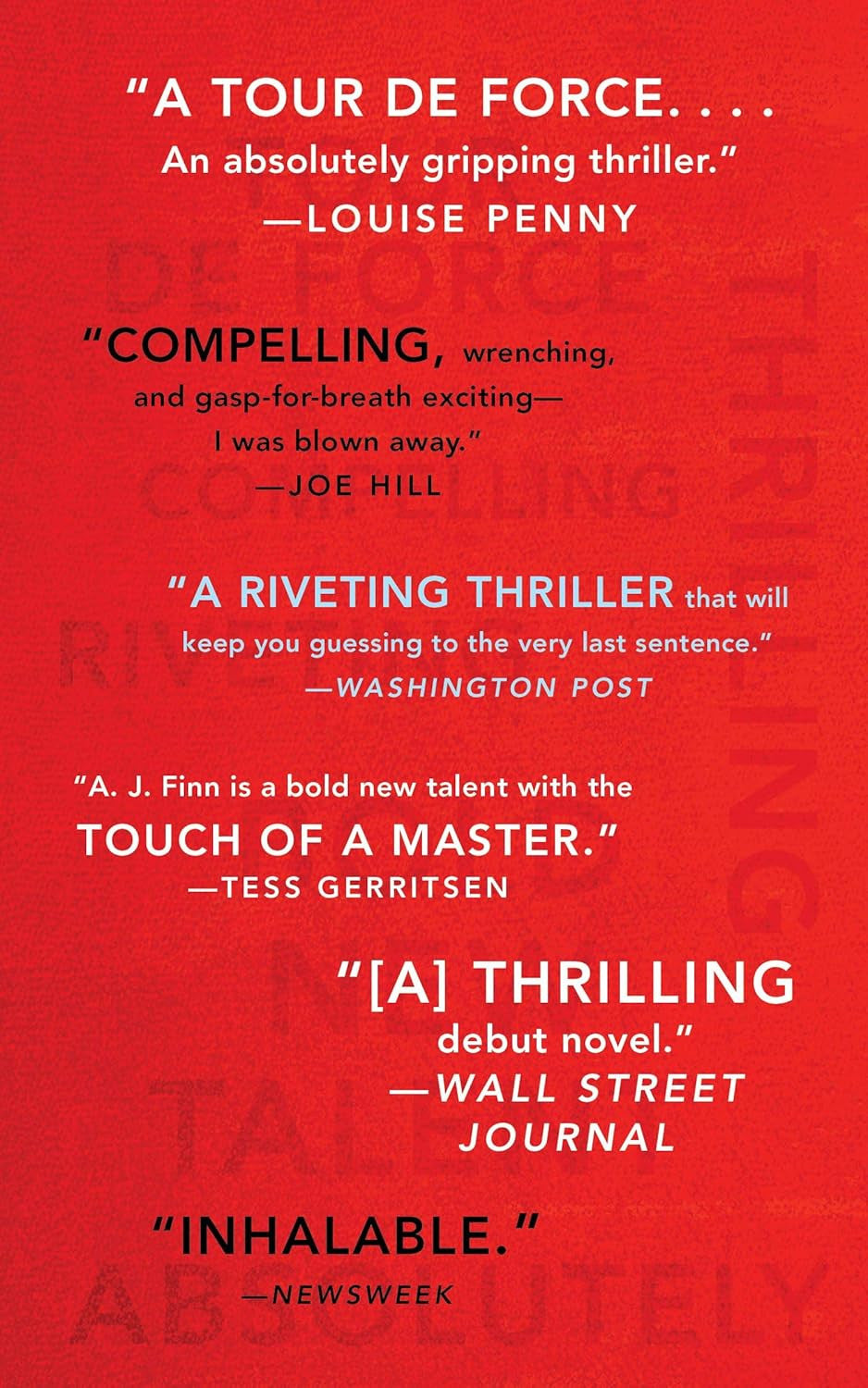 Don’t miss AJ Finn’s eagerly anticipated new thriller, END OF STORY! “As the plot seizes us, the prose caresses us. . . [Finn] has not only captured, sympathetically, the interior life of a depressed person, but also written a riveting thriller that will keep you guessing to the very last sentence.” — Washington Post The #1 bestseller that gripped the world, selling millions of copies around the globe – a tour-de-force Hitchcockian thriller about an agoraphobic woman who believes she witnessed a crime in a neighboring house. It isn’t paranoia if it’s really happening . . . Anna Fox lives alone—a recluse in her New York City home, unable to venture outside. She spends her day drinking wine (maybe too much), watching old movies, recalling happier times . . . and spying on her neighbors. Then the Russells move into the house across the way: a father, mother, their teenaged son. The perfect family. But when Anna, gazing out her window one night, sees something she shouldn’t, her world begins to crumble and its shocking secrets are laid bare. What is real? What is imagined? Who is in danger? Who is in control? In this diabolically gripping thriller, no one—and nothing—is what it seems. Twisty and powerful, ingenious and moving, The Woman in the Window is a smart, sophisticated novel of psychological suspense that recalls the best of Hitchcock.
