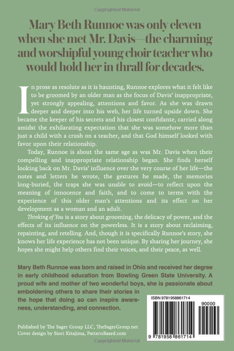 Thinking of You is a story about grooming, the delicacy of power, and the effects of its influence on the powerless. It is a story about reclaiming, repainting, and retelling. And, though it is specifically Runnoe’s story, she knows her life experience has not been unique. By sharing her journey, she hopes she might help others find their voices, and their peace, as well.