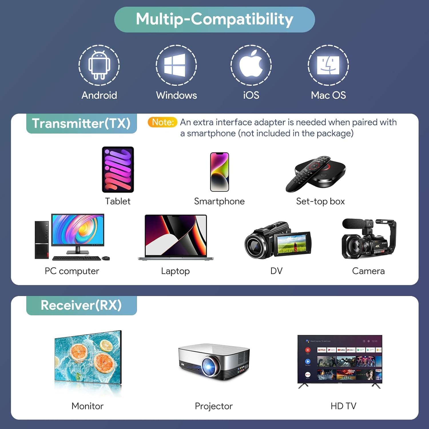 - ✅ UNIQUE FEATURE 1 RX To 8 TX: With this wireless HDMI Kit, a maximum of 8 transmitters can be paired to 1 receiver. (It does not support multiple receivers). When you have important meeting requiring to share contents of your own devices on one screen, this kit provides eay solution to exhibit them from multiple sources.