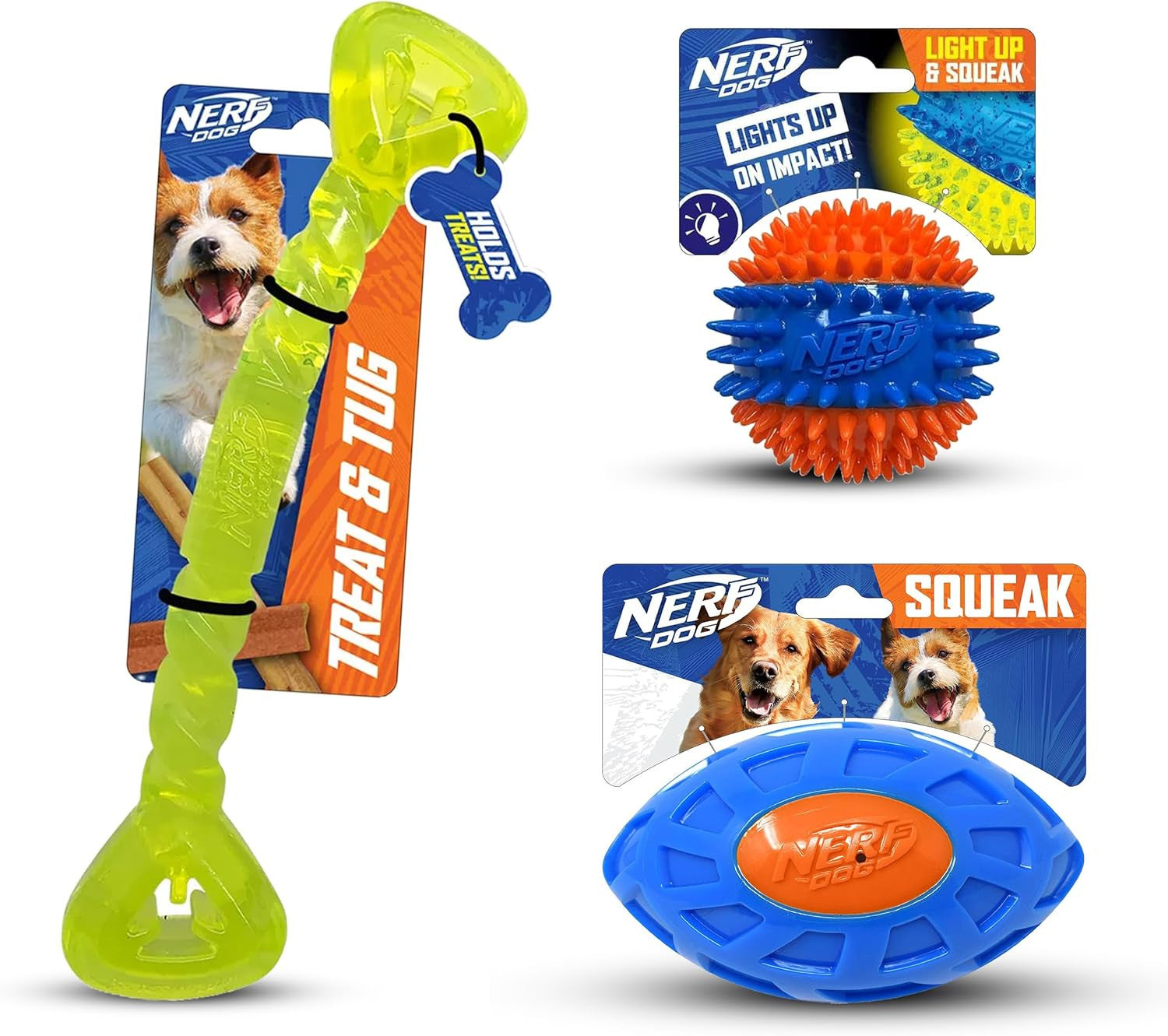 Bring home countless hours of fetching fun with the Nerf Dog 3-Piece Outdoor Toys Gift Set. The set includes the Spike Squeak Ball that's 2.7 inches in diameter, the Treat Tug Bone that's 11 inches in length and the Exo Squeak Football that's 6 inches in length, ideal tug and fetch toys for medium and large dogs. Lightweight and durable, these Nerf fetching toys for dogs are built Nerf Tough with quality materials to withstand hours of play in the backyard and dog park. Plus, the squeaky dog toys are waterproof and weather-resistant, making them great to take to the lake, beach or pool. You don’t have to worry about losing the pet toys no matter how far you throw them - their bright colors make them easy for you and your dog to track! This three-pack of Nerf Dog outdoor toys will entertain you and your dog for hours on end! Explore the whole line of Nerf pet toys for dogs and cats to discover even more fun for you and your furry friend. WARNING: For pet use only. ATTENTION: Supervision is recommended when your pet plays with toys. Remove toy from dog if any part is damaged.