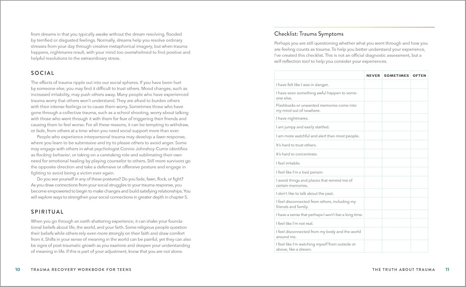 Help teens recover from trauma and look forward to the future The 2022 Best Book Award winner in Young Adult Nonfiction, AmericanBookFest.com. Experiencing trauma and grief―especially at a young age―can make it a challenge to feel excited about everything that life has to offer. The Trauma Recovery Workbook for Teens shows kids ages 12 to 16 that healing is possible, offering a trauma treatment toolbox that encourages them to identify their emotions, embrace resiliency, and find a renewed sense of hope and happiness. The truth about trauma―This trauma workbook for teens clearly explains different types of trauma―from political upheaval to childhood trauma, and sexual abuse―so teens can understand where their feelings come from. Strategies for healing―Let teens take action with activities for trauma and recovery like meditation, spotting potential triggers, tracking their thoughts, and more. Feeling seen―Teens will find comfort and reassurance through stories and questions inspired by other teens who have also experienced trauma. This trauma-informed mental health book gives teens an effective way to work through the past and strengthen their sense of self.
