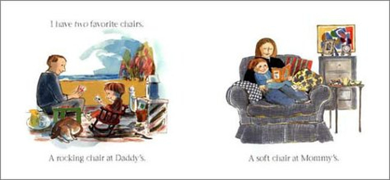 At Mommy’s house, Alex has a soft chair. At Daddy’s house, Alex has a rocking chair. In each home, Alex also has a special bedroom and lots of friends to play with. But whether Alex is with Mommy or with Daddy, one thing always stays the same — Alex is loved. The gently reassuring text focuses on what is gained rather than what is lost when parents divorce, while the sensitive illustrations, depicting two unique homes in all their small details, firmly establish Alex’s place in both of them. Two Homes will help children — and parents — embrace even the most difficult of changes with an open and optimistic heart.