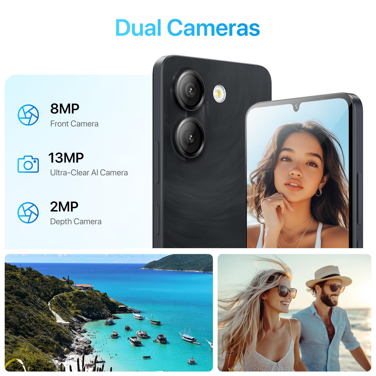 - 𝟏𝟑+𝟐+𝟖𝐌𝐏 𝐂𝐚𝐦𝐞𝐫𝐚: The G9A cell phone 13MP + 2MP rear camera produces sharp, clear, detailed photos. 2MP secondary lens further enhances the shots. 8MP camera makes your selfies clearer and more natural. And easily shows the most beautiful yourself.