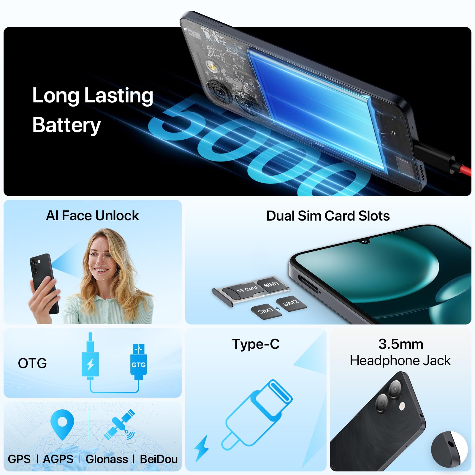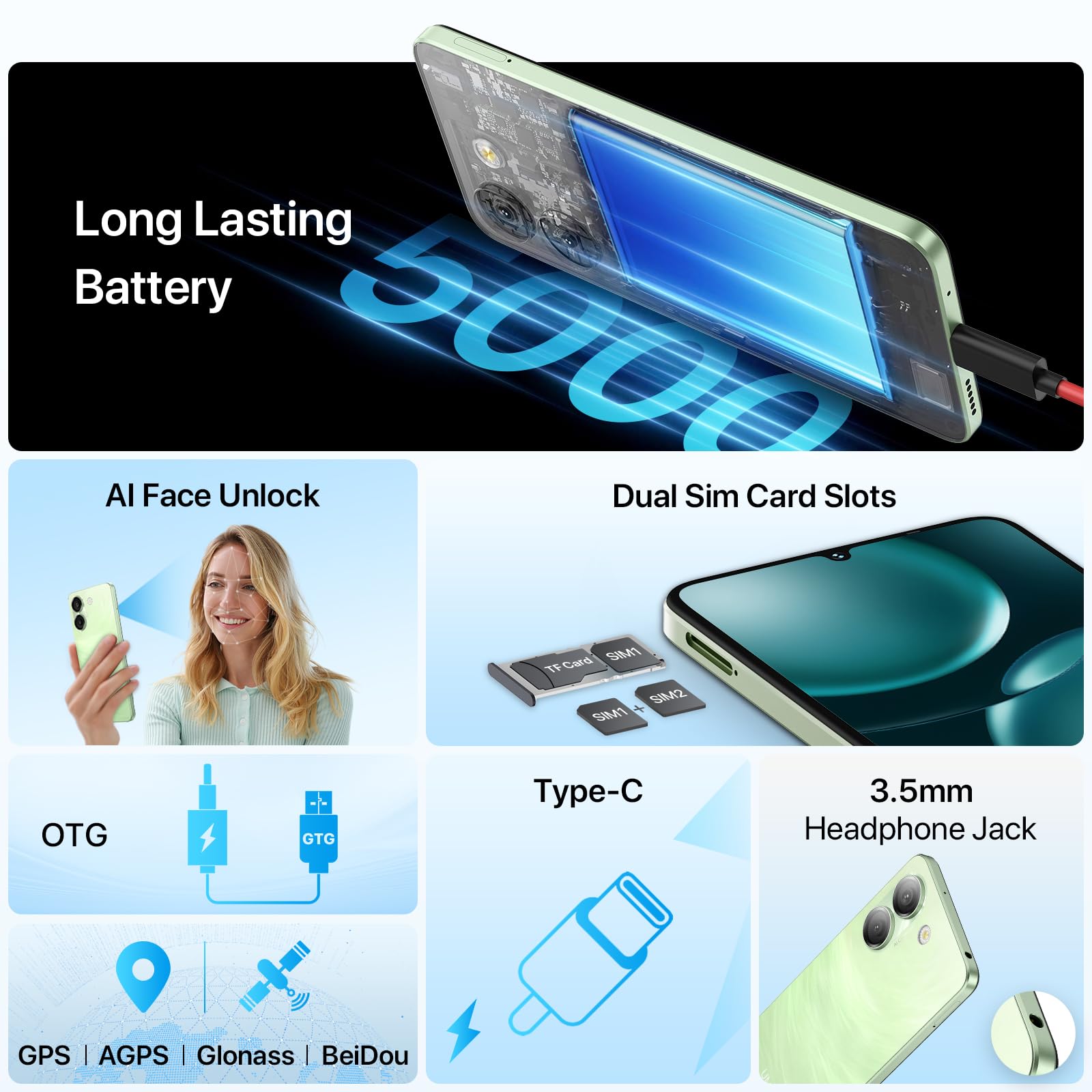 - 𝐀𝐧𝐝𝐫𝐨𝐢𝐝 𝟏𝟒 𝐆𝐨 𝐒𝐲𝐬𝐭𝐞𝐦: The G9A unlocked android phone with Android 14 Go system. Provide you with reliable security to ensure system stability, with higher application adaptability, smaller space occupation, more efficient operation.