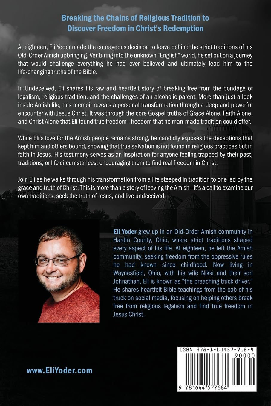In Undeceived, Eli shares his raw and heartfelt story of breaking free from the bondage of legalism, religious tradition, and the challenges of an alcoholic parent. More than just a look inside Amish life, this memoir reveals a personal transformation through a deep and powerful encounter with Jesus Christ. It was through the core Gospel truths of Grace Alone, Faith Alone, and Christ Alone that Eli found true freedom— freedom that no man-made tradition could offer.