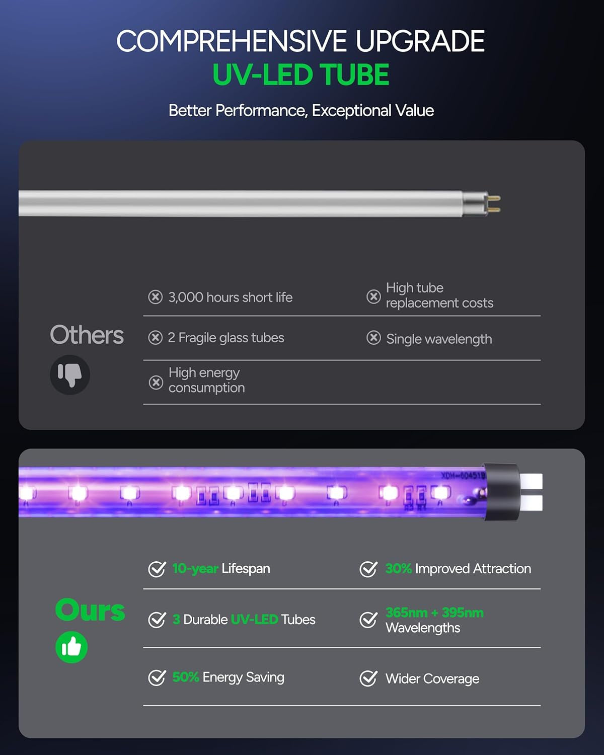 When does the bug zapper work better? Sunlight or nearby lamps will compete with the zapper's UV light, making it less attractive to insects. For optimal results, use it at night and place it away from other lights to ensure it remains the main attraction. How can I make my bug zapper more effective? Mosquitoes are naturally drawn to body heat and carbon dioxide from people and pets. If the zapper is too close to them or other lights, it may be less effective. For best results, place it away from people, pets and competing light sources. Why does the bug zapper light appear dim? Buzbug uses advanced dual-band UV-LED technology, emitting wavelengths of 365nm and 395nm—both highly attractive to bugs but naturally faint to the human eye, especially the 365nm band. What seems dim to us is actually powerful in attracting bugs. Why isn't my bug zapper attracting insects? Some insects, such as fruit flies, may need extra bait to be lured toward the electric grid. These flies are attracted to natural sugars, so placing a piece of fruit or a drop of apple cider vinegar on the tray can help draw them in.