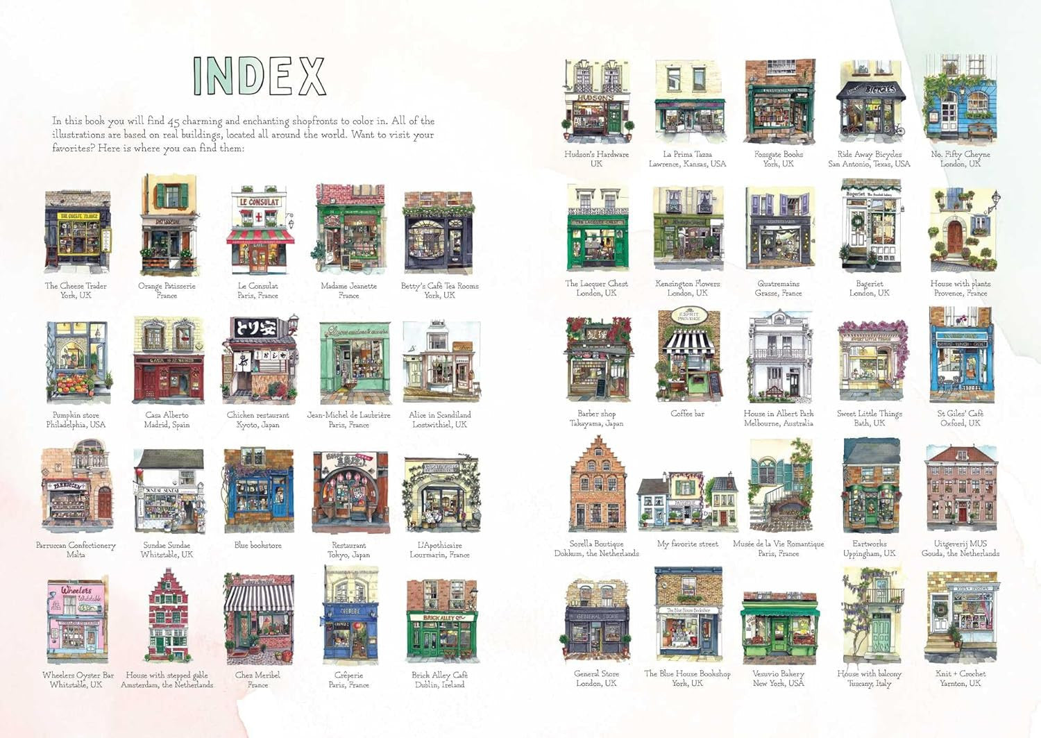 Discover the hidden magic of everyday buildings in The Urban Anna Coloring Book. From shopfronts and pubs to office buildings and tearooms, from Paris to Madrid, Kyoto to New York City, add color to the beautiful and detailed illustrations that make every building charming and enchanting.