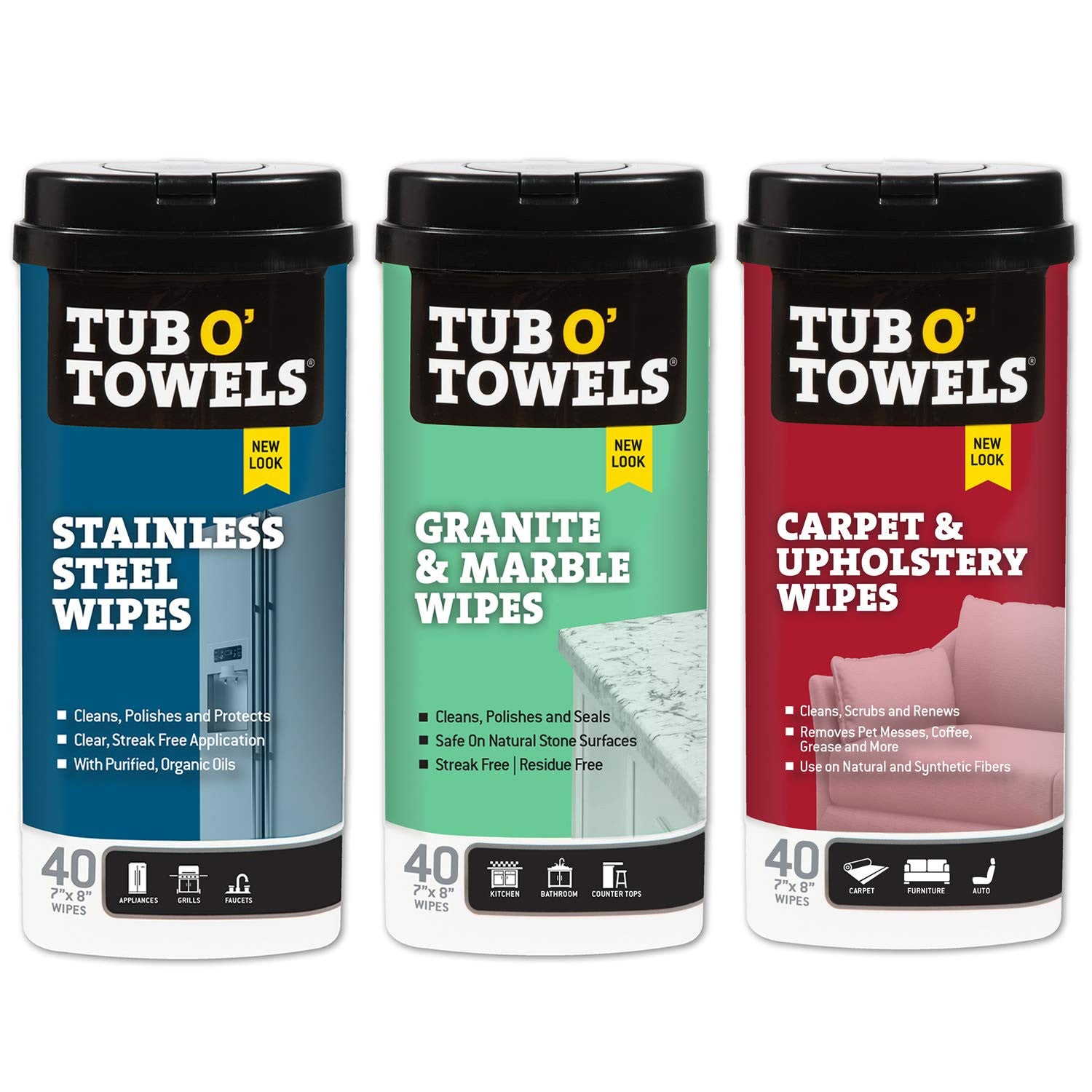 They are bigger, tougher and soaked with a knock-your-socks-off cleaning solution that overpowers even the most onerous grime. Unlike typical wimpy wipes, these thick towels hold up to vigorous scrubbing. Use them inside, outside, on the job, or on the go. There's almost nothing they won't clean. Bigger jobs call for a bigger towel. Variety pack includes 1-canister of upholstery wipes, 1-canister of stainless steel wipes, and 1-canister of granite and marble wipes 7" x 8" size per wipe. 40 wipes per canister.