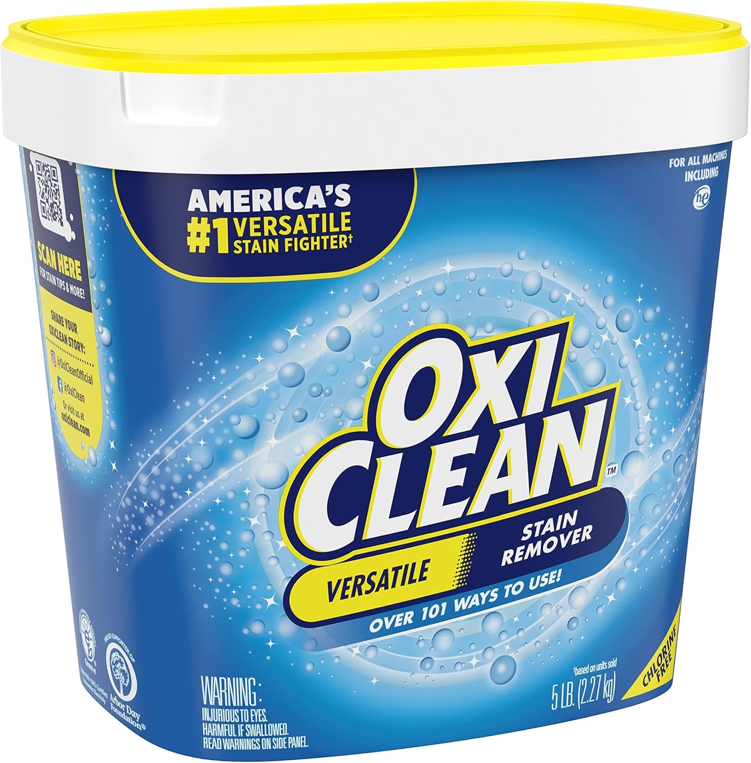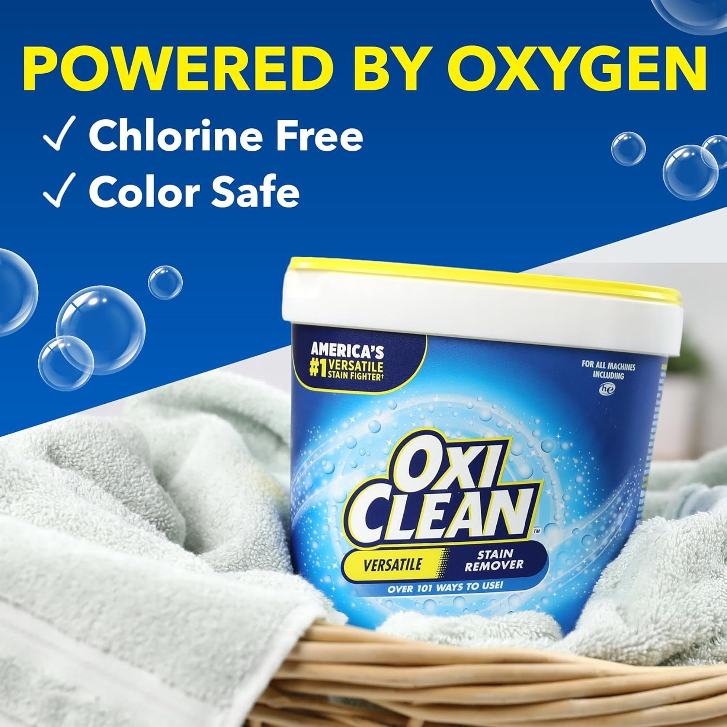 Harness the power of oxygen to fight stains with OxiClean Versatile Stain Remover Powder, from America’s #1 stain remover additive brand.(1) With over 101 uses, it’s the ultimate stain fighter for big and small messes for laundry and home. This oxygen-powered, chlorine-free, color-safe clothes stain remover cleans dirt and stains from your favorite machine-washable clothes, sheets, towels, shoes, hats, workout gear, and kids’ and baby clothes. For best results, presoak items in Versatile Stain Remover and water following label directions. Then add Stain Remover Powder to the washer as a laundry booster per label directions, add items, and wash with detergent in HE or standard machines to get items extra clean. Not just for clothes, mix OxiClean powder with water, following label directions, to make a cleaning solution as a bathroom cleaner, kitchen cleaner, floor cleaner, carpet spot remover, furniture cleaner, and stain cleaner for hard and soft surfaces in your home. This 5 lb container is enough for all your big and small messes. Also available in Versatile Stain Remover Free and Baby. From stain removers and laundry boosters to household cleaners and much more, OxiClean offers a product to fit your needs. (1) based on units sold