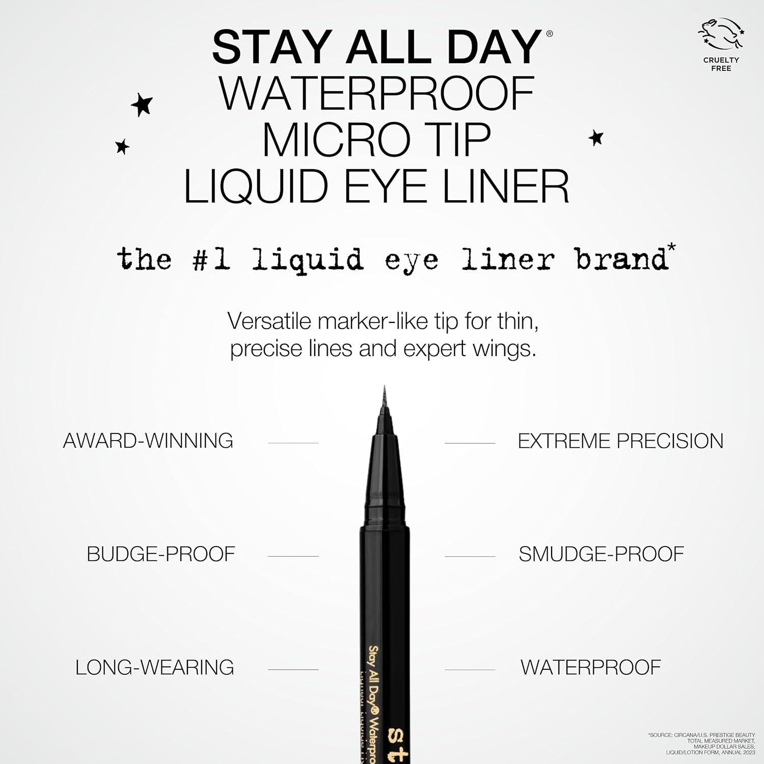 Awarded to the Stay All Day Dual-Ended Waterproof Liquid Eye Liner Awarded to the Stay All Day Original Waterproof Liquid Eye Liner Precise tip Delivers any look - from a thin line to a bold, dramatic stroke. Ultra-precise tip For superior control and accuracy. Precise and ultra-precise tips Both tips are available - choose the style that you like! Waterproof Won't wear off under water. Waterproof Won't wear off under water. Waterproof Won't wear off under water. Fast Drying Dries quickly. Fast Drying Dries quickly. Fast Drying Dries quickly. Smudge-Proof Won't smudge. Smudge-Proof Won't smudge. Smudge-Proof Won't smudge. From the manufacturer