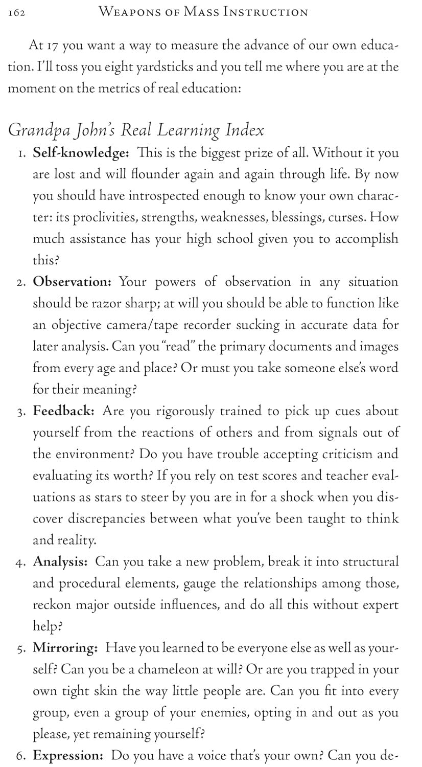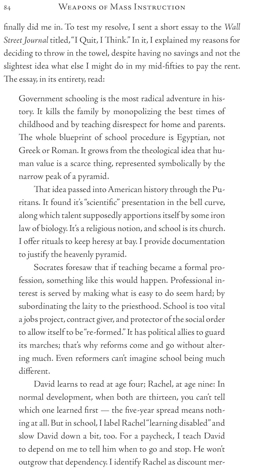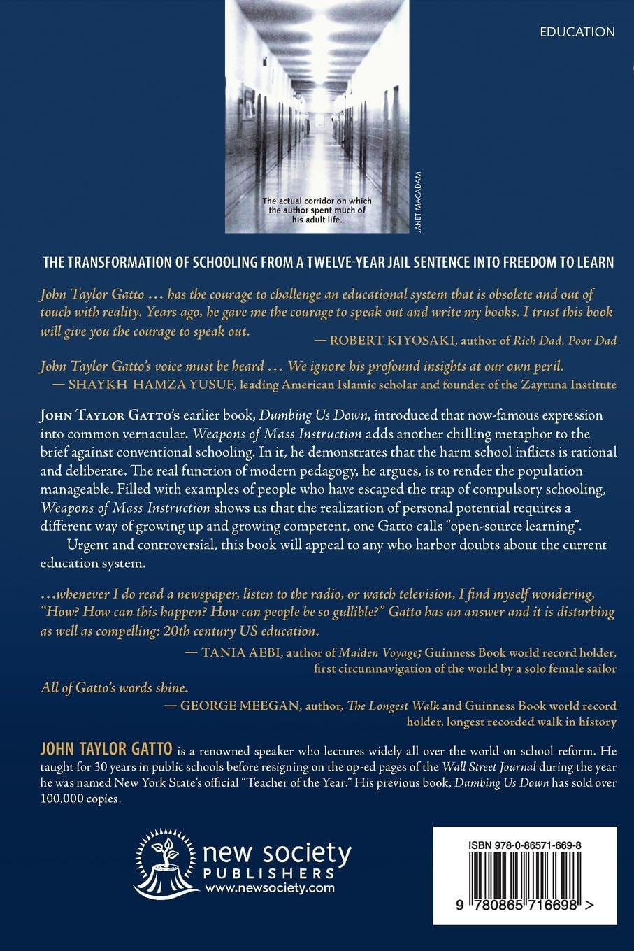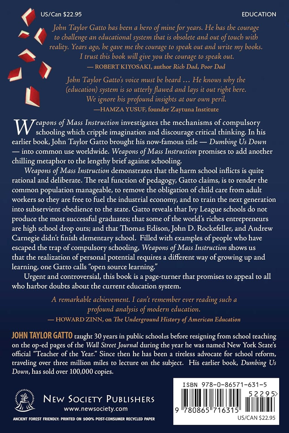 The transformation of schooling from a twelve-year jail sentence to freedom to learn. John Taylor Gatto's Weapons of Mass Instruction , now available in paperback, focuses on mechanisms of traditional education which cripple imagination, discourage critical thinking, and create a false view of learning as a byproduct of rote-memorization drills. Gatto's earlier book, Dumbing Us Down , introduced the now-famous expression of the title into the common vernacular. Weapons of Mass Instruction adds another chilling metaphor to the brief against conventional schooling. Gatto demonstrates that the harm school inflicts is rational and deliberate. The real function of pedagogy, he argues, is to render the common population manageable. To that end, young people must be conditioned to rely upon experts, to remain divided from natural alliances and to accept disconnections from their own lived experiences. They must at all costs be discouraged from developing self-reliance and independence. Escaping this trap requires a strategy Gatto calls "open source learning" which imposes no artificial divisions between learning and life. Through this alternative approach our children can avoid being indoctrinated-only then can they achieve self-knowledge, good judgment, and courage.