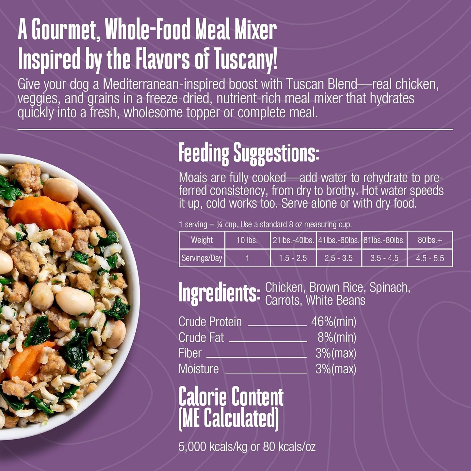 Item model number Tuscan Blend Unit Count 32 Ounce Number of Items 2 Item Dimensions LxWxH 4 x 10 x 12 inches Color Green Product Dimensions 4 x 10 x 12 inches; 2 Pounds Item Weight 32 Ounces Allergen Information Preservative-Free Target Audience Keyword dogs Directions SERVING INFORMATION: 1 Serving : ¼ Cup. Use a Standard 8oz Measuring Cup. Measure out servings using chart on the back of the bag. Add equal parts hot or boiling water and stir. Wait 5 minutes and stir again. If using boiling water, cool slightly before serving. Adjust amount of water for a different consistency - from dry to brothy. Meals are fully cooked, so water is used to rehydrate only. Hotter or boiling water speeds the process, however colder water can be used. Feed alone or mix with your dog's favorite dry food. Enjoy! Flavor Tuscan Blend Size 1 Pound (Pack of 2) Item Form Freeze Dried Item Package Dimensions L x W x H 11.85 x 9.57 x 3.86 inches