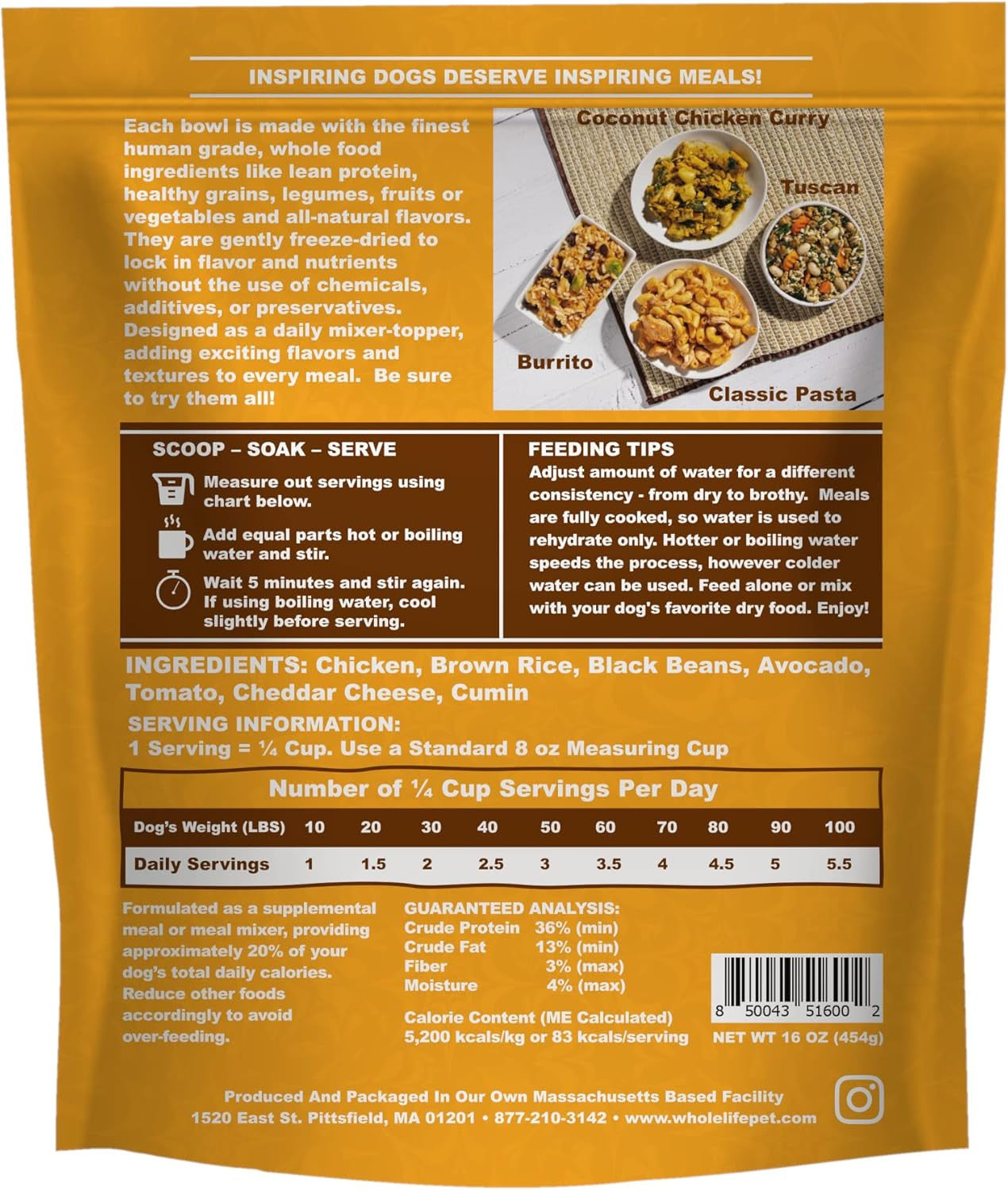 Item model number Burrito Bowl Unit Count 16.0 Ounce Number of Items 1 Color Brown Item Form Freeze Dried Product Dimensions 4 x 10 x 12 inches; 1 Pounds Specific Uses for Product Food Topper Item Weight 16 Ounces Allergen Information Preservative-Free Target Audience Keyword Dogs, dogs Age Range (Description) All Life Stages Directions SERVING INFORMATION: 1 Serving = ¼ Cup. Use a Standard 8oz Measuring Cup. Measure out servings using chart on the back of the bag. Add equal parts hot or boiling water and stir. Wait 5 minutes and stir again. If using boiling water, cool slightly before serving. Adjust amount of water for a different consistency - from dry to brothy. Meals are fully cooked, so water is used to rehydrate only. Hotter or boiling water speeds the process, however colder water can be used. Feed alone or mix with your dog's favorite dry food. Enjoy! Package Information Bag Flavor Burrito Bowl Breed Recommendation All Breed Sizes Model Name Bistro Bowl For Dogs - Human Grade Meal Mixer Food Topper - Healthy Whole Food Ingredients, Protein Rich, All Natural - Picky Eaters Item Package Dimensions L x W x H 11.46 x 9.72 x 3.31 inches Item Dimensions LxWxH 4 x 10 x 12 inches