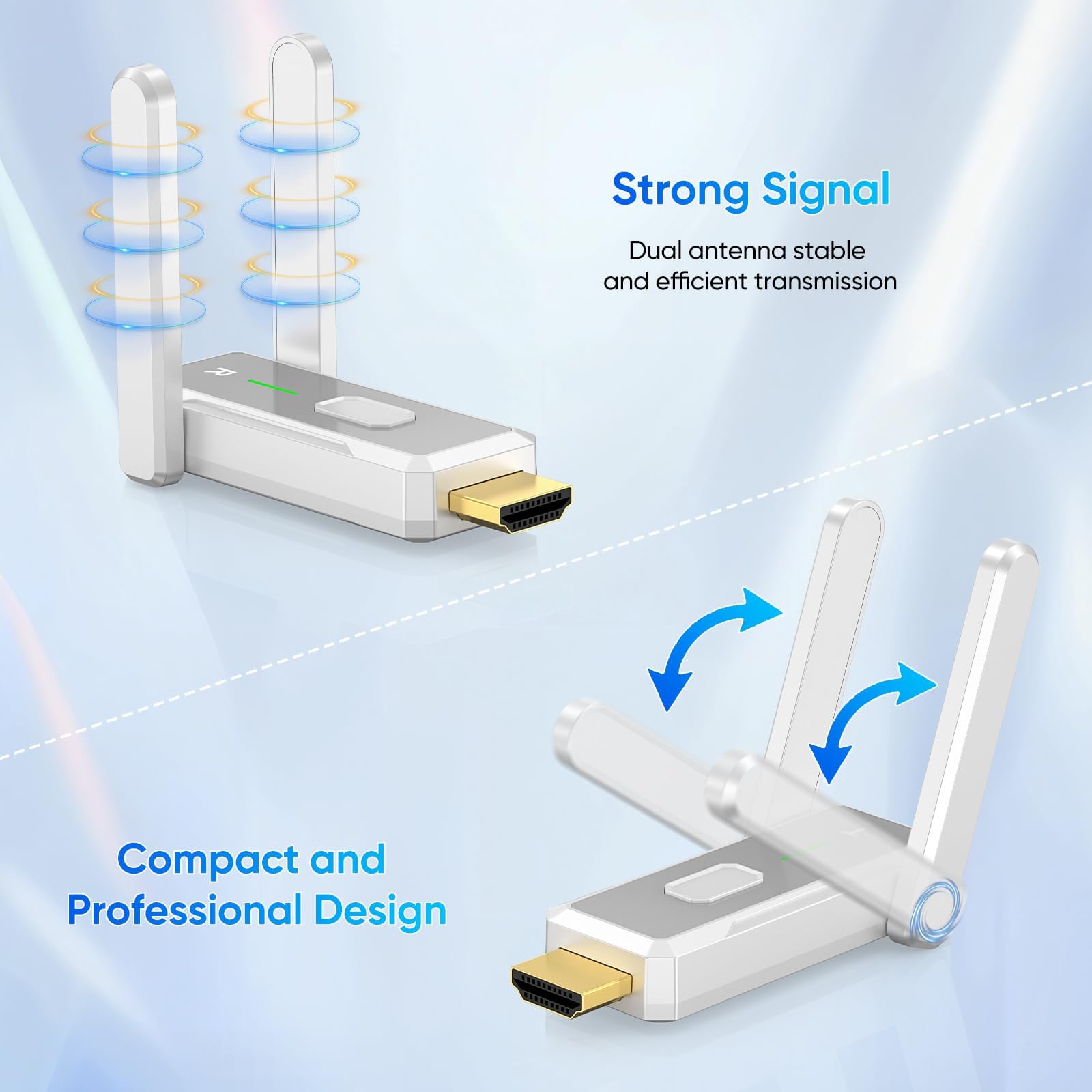 - Extended Range, Plug and Play : HDMI sender and receiver wireless equipped with a dual-antenna system that enhances signal penetration, it achieves a transmission distance of up to 500 feet/150 meters, catering to diverse needs in homes and offices. No Wi-Fi, no Bluetooth required—just plug in and connect in seconds for a smooth video experience that enhances your life and work. Note: Transmission distance may reduce to 100 feet/30 meters when passing through walls.
