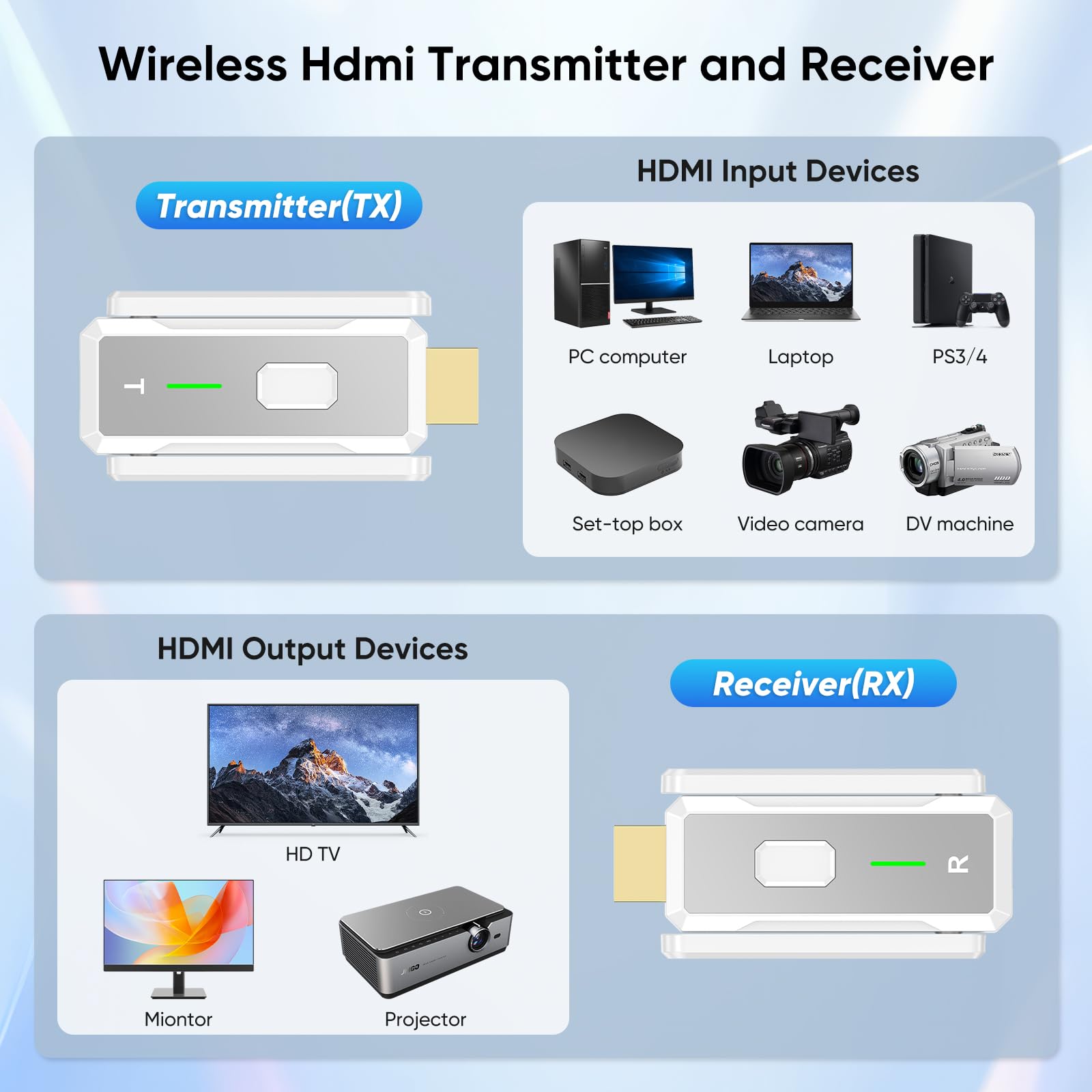 - Stable Supply, Exceptional Performance : Wireless hdmi transmitter and receiver supports mirroring and extension functions, allowing you to project the content from devices as laptops, cameras, and cable TV set-top boxes onto high-definition TVs, projectors, and displays, providing a versatile application experience. Enjoy convenience experience via wireless hdmi transmitter and receiver!We recommend using a 5V/1A charger to power the wireless HDMI transmitter and receiver , ensuring ample current and stable voltage output for optimal device performance. HDMI wireless receiver and transmitter can also be powered through the USB ports of laptops, monitors, or TVs.