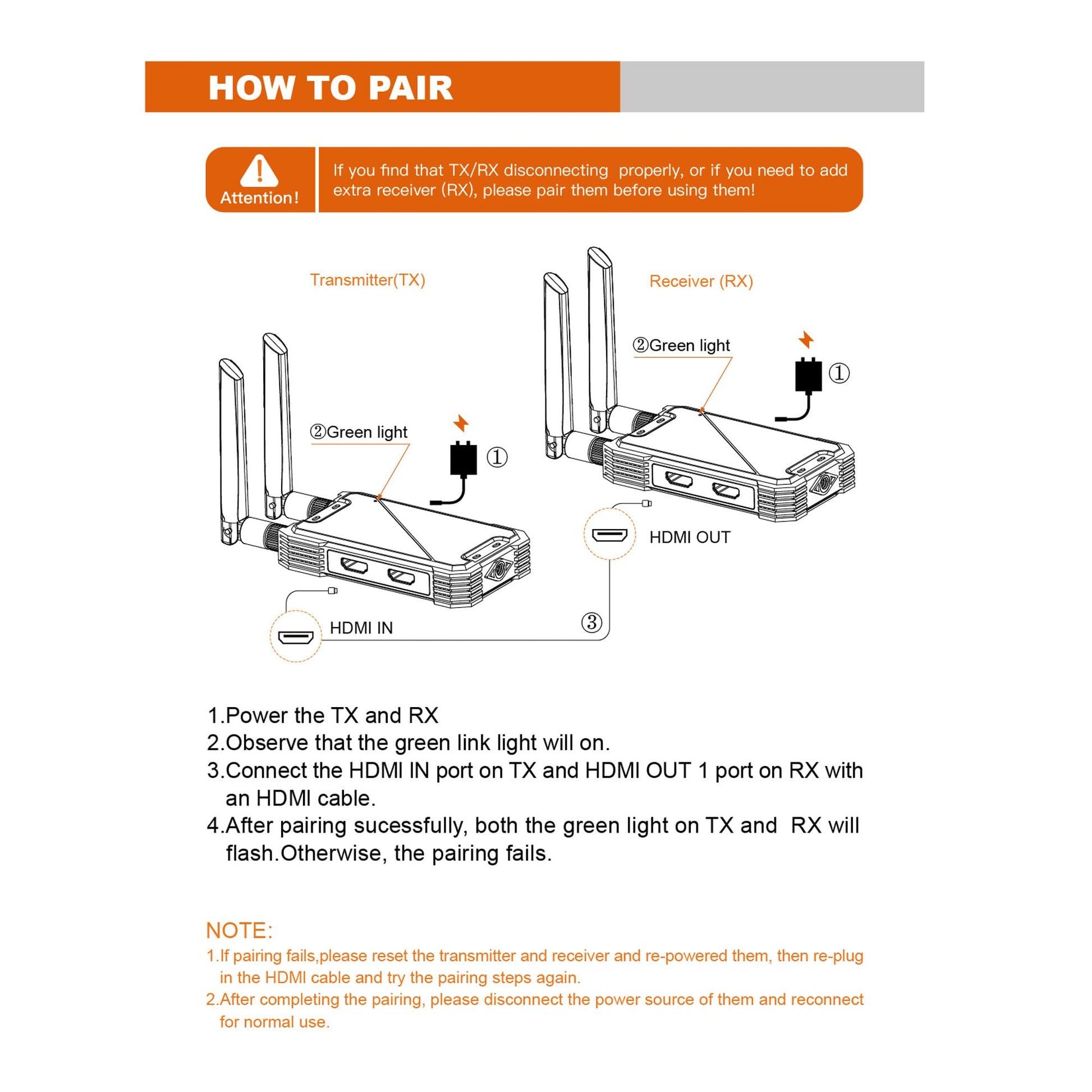 - Support up to 1TX to 5RX:Wireless HDMI Extender can switch between up to 5 different devices. As the RX increases, the wireless transmission distance will decrease