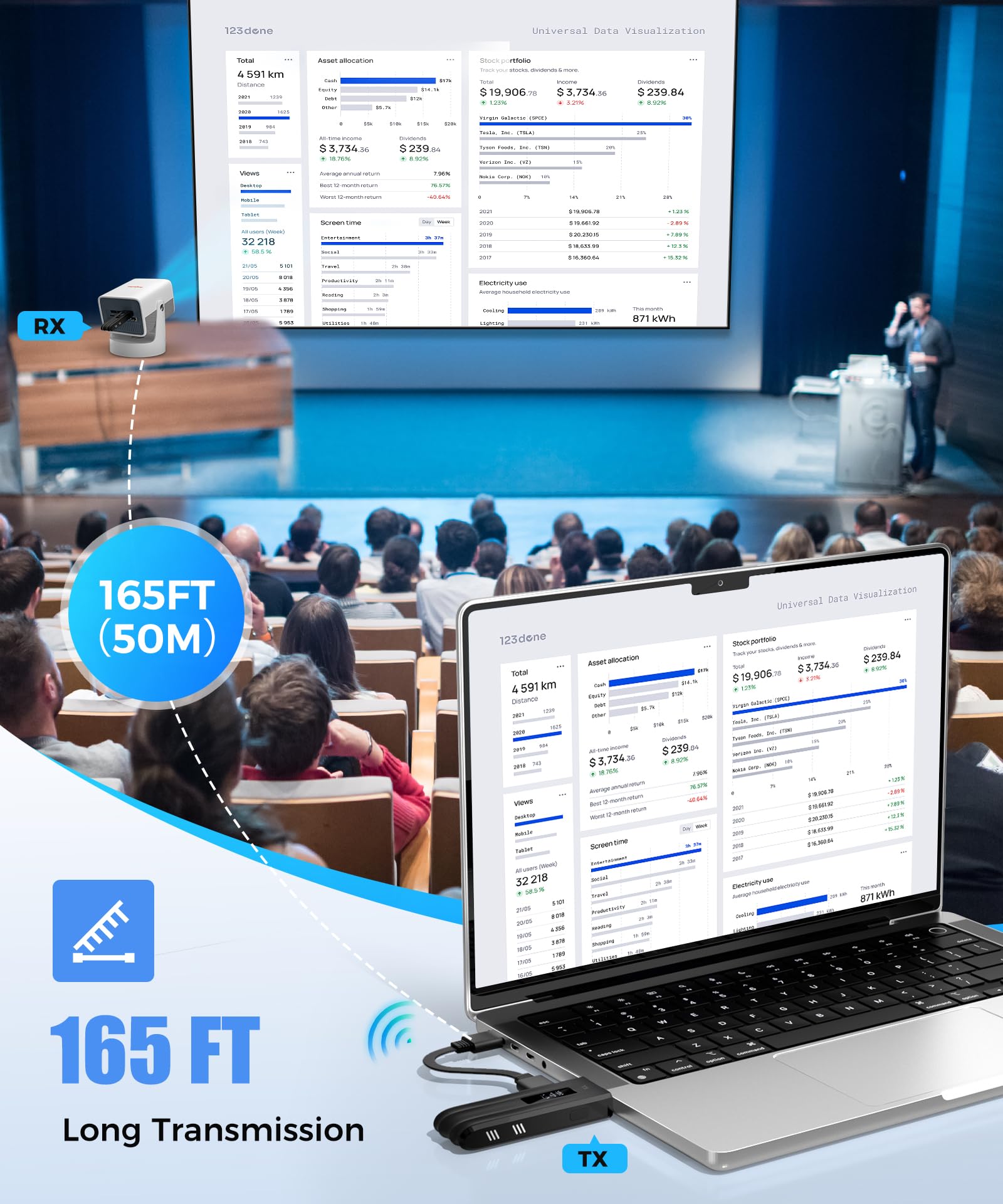 - 【165FT Strong Transmission Distance】Reach up to 165 feet in open environments, ideal for home theaters, conference rooms, and outdoor activities, providing flexibility for various use scenarios,(Note: Transmission distance and speed may be affected when the product passes through walls or encounters obstacles)